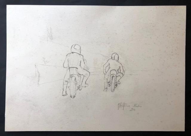 Studio (Due motociclisti). Disegno a lapis su cartoncino, cm 34 x 48,5 circa. Firmato, titolato e datato in basso a destra “Giacomo Vaccaro Studio 1974”. Alcune macchioline di umido ma buono stato.