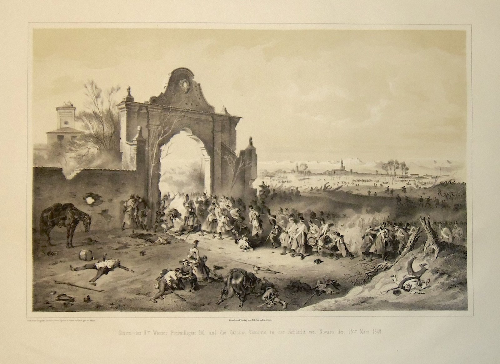 Litografia, mm 270x415. Animata scena dell'assalto austriaco a cascina Visconte. Tratta da "Erinnerung and die italienische Feldzuege der K.K. osterreich. Armee, 1848-49". Bell'esemplare con qualche fioritura ai margini. <BR><BR>
