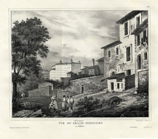 SUBIACO - "Vue du Grand Sèminaire à Subiaco" Coignet del. - P. Gentil Mans de Bordeaux lith. animato scorcio con case e il seminario.
