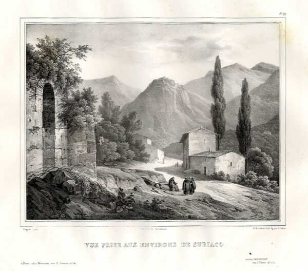 SUBIACO - "Vue prise aux environs de Subiaco" Coignet del. - A. Bichebois lith. Paesaggio con frati.