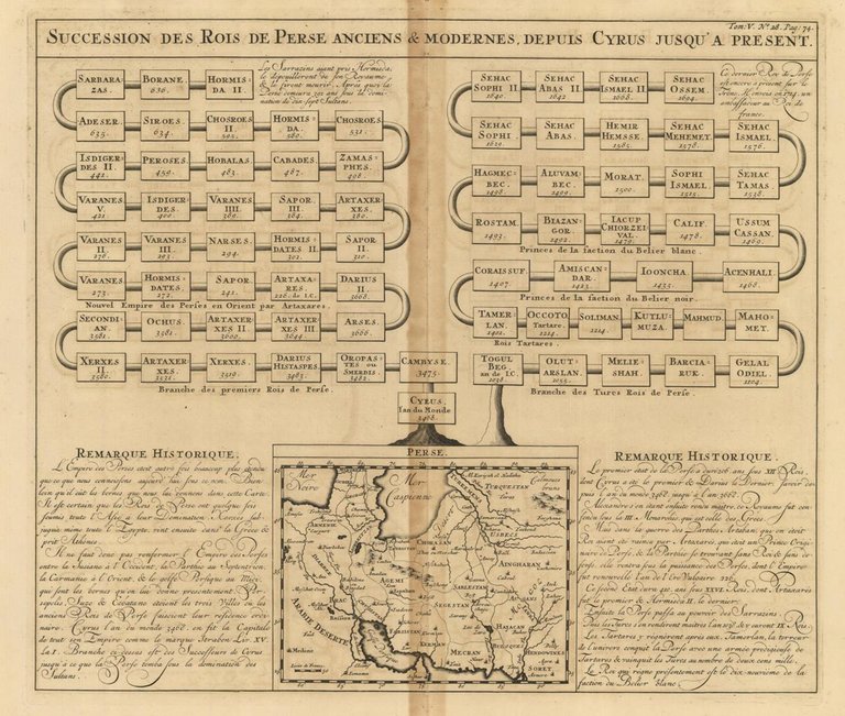 Stamoa, antica ed originale, con albero genealogico inciso, raffigurante i re di Persia, da Ciro nel 3468 a.C. a Sehac Ossem nel 1694, con mappa inserita "Perse". Include testo descrittivo inserita nel V Tomo ”Atlas Historique ou nouvelle introduction a l’Histoire, à la Chronologie & à la Geographie Ancienne & Moderne…”, pubblicato ad Amsterdam nel 1719. Atlante che, con la sua pubblicazione, coniuga le mappe geografiche con incisioni e informazioni di carattere geografico, araldico, etnografico e storico così rendendo l’opera in sette volumi molto innovativa.Henri Abraham Chatelain (1684 - 1743), pastore ugonotto originario di Parigi visse alternativamente a Parigi, Londra, L'Aia ed Amsterdam. Conosciuto come cartografo olandese per il sua opera cartografica monumentale in sette volumi “Atlas Historique” pubblicata ad Amsterdam con i suoi fratelli.
