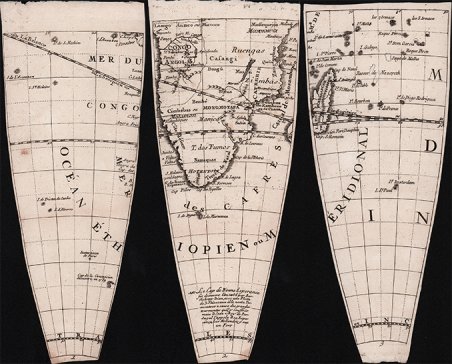 Tre fusi di globo raffiguranti l’Africa Meridionale, parte del raro Globe terrestre rédigé d'après les observations astronomiques les plus justes et les plus récentes / par M. Buy de Mornas, stampato a Parigi nel 1768. Claude Buy de Mornas fu geografo del Re Luigi XVI e del Duca di Berry a partire dal 1764. Contribuì a facilitare lo studio di questa scienza nel XVIII secolo pubblicando due celebri atlanti: Atlas Méthodique et Elémentaire de Géographie et d' Histoire, 1761, Atlas Historique et Géographique, 1762. Il globo del Buy de Mornas è piuttosto raro; un set completo delle gore è conservato alla Bibliothèque nationale de France, département Cartes et plans [GE D-12572] http://catalogue.bnf.fr/ark:/12148/cb40734540w Incisioni in rame, rifilate alla linea marginale, in perfetto stato di conservazione. Three globe gores depicting South Africa, part of the rare Globe terrestre rédigé d'après les observations astronomiques les plus justes et les plus récentes / par M. Buy de Mornas, printed in Paris in 1768. Claude Buy de Mornas was geographer to King Louis XVI and the Duke of Berry beginning in 1764. He helped facilitate the study of this science in the 18th century by publishing two famous atlases: Atlas Méthodique et Elémentaire de Géographie et d' Histoire, 1761, Atlas Historique et Géographique, 1762. The Buy de Mornas globe is quite rare; a complete set of the gore is preserved at the Bibliothèque nationale de France, département Cartes et plans [GE D-12572] http://catalogue.bnf.fr/ark:/12148/cb40734540w Copperplate engravings, trimmed at the marginal line, in perfect condition. Cfr.