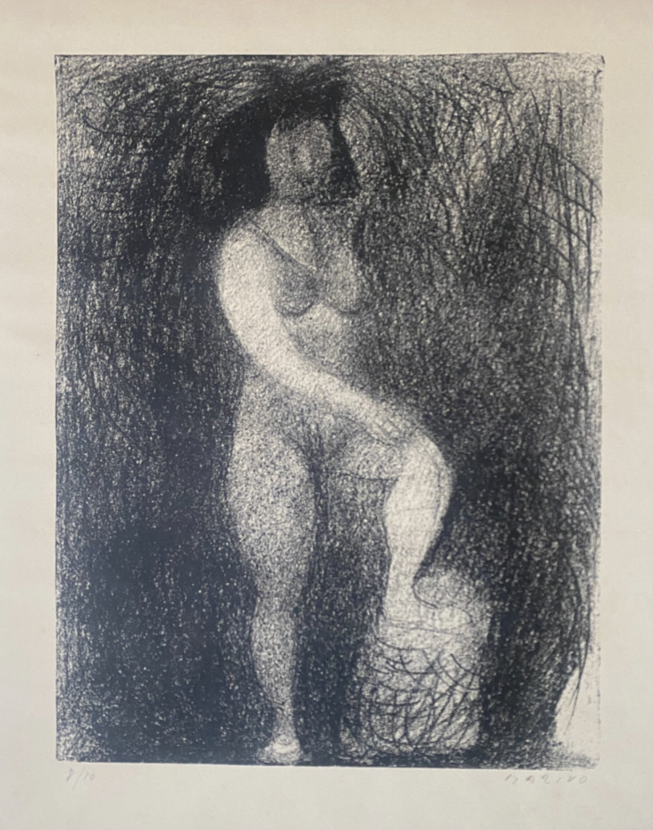 Le prime prove di incisione risalgono agli Anni Venti. Vi si dedicherà con regolarità a partire dal 1941 avanzando, in parallelo con la scultura, per temi: la figura della donna, metafora della potenza genitrice e il cavaliere in riferimento al monumento equestre. Nel foglio la sagoma della donna colta a figura intera, con la gamba sinistra poggiata su un rialzo, emerge da un delicato chiaroscuro che esalta il vigore della forma, immobile e scultorea. L'opera appartiene ad un gruppo di 13 litografie dedicate alla figura femminile ed eseguite nel 1941 durante il rifugio in Svizzera. Sono tutte tirate a pochi esemplari e oggi certamente rare. Firma e numerazione nel margine inferiore a matita. Esemplare n 8/10. Tiratura complessiva a 10 esemplari firmati e numerati eseguita dalla Stamperia Salvioni di Bellinzona su carta a mano giallina.