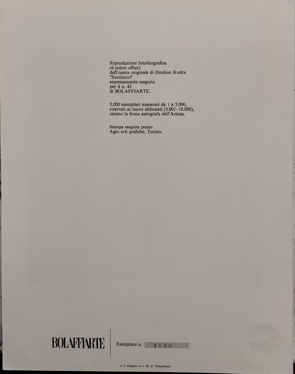 Riproduzione fotolitografica (6 colori offset) dell'opera originale di Ibrahim Kodra eseguita per il n. 42 di BOLAFFIARTE