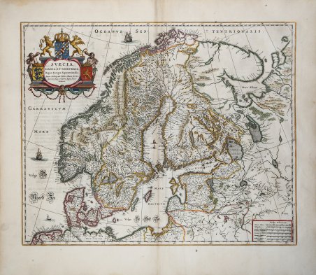 Una straordinaria carta dei regni di Svezia, Danimarca e Norvegia (Scandinavia), attribuita ad Anders Bure (1571-1646), cartografo e matematico svedese. Bure, conosciuto anche come Andreas Bureus, è noto soprattutto per la sua carta della Scandinavia in 6 fogli. Il Regno di Svezia è raffigurato nella sua massima estensione, comprendendo l'attuale Finlandia e gli Stati baltici. La carta è ricca di dettagli su città, confini politici, fiumi e topografia. Gli stemmi dei tre regni, una corona, due vecchi e due leoni sono tutti presenti nel cartiglio decorativo del titolo. Pubblicato per la prima volta da W. J. Blaeu nel 1634, questo esemplare proviene da Atlas Maior, Sive Cosmographia Blaviana, Qua Solum, Salum, Coelum, Accuratissime Describuntur. Amsterdam, J. Blaeu, 1662-65. Willem Janszoon Blaeu, avviò nel 1599 la sua attività di costruttore di globi e strumenti astronomici ad Amsterdam. Nel 1630, dopo aver comprato alcune lastre dell’atlante del Mercator da Jodocus Hondius II, fu in grado di pubblicare un volume di 60 mappe con il titolo di ' Atlantis Appendix. Cinque anni dopo, pubblicò i primi due volumi del suo atlante ' Atlas Novus ' o ' Theatrum Orbis Terrarum, ' in sei libri. Dopo la sua morte, Joan (Johannes) continuò l’opera paterna, completando l’intera serie di sei volume dell’Atlas Novus ' intorno al 1655. Fu inoltre autore di un ' Atlas Maior sive Cosmographia Blaviana, in 12 volumi pubblicati nel 1662 -72. Incisione in rame, finemente colorata a mano, in ottimo stato di conservazione. Bibliografia Van der Krogt 2, 1210:2. A striking map of the kingdoms of Sweden, Denmark and Norway (Scandinavia), attributed to Anders Bure (1571-1646), a Swedish cartographer and mathematician. Bure, also known as Andreas Bureus, is best known for his 6-sheet map of Scandinavia. The Kingdom of Sweden is shown at its largest extent, containing present day Finland and the Baltic states. The map is filled with details of towns, political boundaries, rivers, and topography. The coats of arms of the three kingdoms, a crown, two old men and two lions are all featured within the decorative title cartouche. First published by W. J. Blaeu in 1634, this example comes from Atlas Maior, Sive Cosmographia Blaviana, Qua Solum, Salum, Coelum, Accuratissime Describuntur. Amsterdam, J. Blaeu, 1662-65. Willem Janszoon Blaeu, started in 1599 his business as a builder of globes and astronomical instruments in Amsterdam. In 1630, after buying some plates of the Mercator atlas from Jodocus Hondius II, he was able to publish a volume of 60 maps under the title ' Atlantis Appendix. Five years later, he published the first two volumes of his atlas ' Atlas Novus ' or ' Theatrum Orbis Terrarum, in six books. After his death, Joan (Johannes) continued his father's work, completing the entire six-volume ' Atlas Novus ' series around 1655. He was also the author of an ' Atlas Maior sive Cosmographia Blaviana, in 12 volumes published in 1662 -72. Copperplate, with fine later hand colour, good condition. Bibliografia Van der Krogt 2, 1210:2. Cfr.
