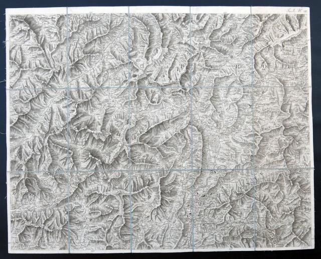 Dalla “Carta Amministrativa del Regno d’Italia co' suoi stabilimenti politici, militari, civili e religiosi e con una parte degli stati limitrofi. Costrutta nel Deposito della Guerra per ordine del Ministro della Guerra e Marina nell'anno MDCCCXI, aggiunta e corretta nell'anno 1813”, edita a Milano nel 1813 (una grande carta composta da più fogli quadrettati e applicati su tela d'epoca, ciascuno di cm 54 x 67 circa per un perimetro totale di cm 1400 x 1100 circa), carta con gran parte del Nord Italia, comprendente parte della Lombardia e degli attuali Trentino e Alto Adige, e che si estende, andando da nord a sud e in direzione ovest – est, da S. Morizo (S. Moritz) e Sondrio, fino a Brunico e la Val Sugana. La carta è composta da un foglio, numerato come foglio VIII sulla parte incisa, e con il numero 8 al retro della tela. Benedetto e Gaudenzio Bordiga furono incisori e cartografi, originari della Valsesia e attivi a Milano nella prima metà del XIX secolo, un periodo caratterizzato da alterne vicende storico politiche, in cui realizzarono un discreto corpus incisorio. L'opera più importante cui contribuirono fu la “Carte générale du Théâtre de la Guerre en Italie”, una grande carta commissionata, nel 1797 dallo Stato Maggiore dell'Armata Francese di Napoleone, al capo battaglione Bacler d'Albe, capo del Gabinetto Cartografico Francese: la carta, celebrativa della prima campagna d'Italia, fu in gran parte realizzata a partire da carte preesistenti, fu realizzata in cinquantaquattro fogli sotto la direzione di Giacomo Pinchetti e fu appunto incisa dai fratelli Benedetto (1800 - 1834) e Gaudenzio Bordiga. Gaudenzio Bordiga (Camasco, Varallo, 10 febbraio 1773 – Milano, 18 gennaio 1837), seguì a Varallo studi letterari e di disegno. Stabilitosi a Milano con il fratello Benedetto, fu capo incisore dell'Istituto Geografico Militare e mantenne tale carica anche dopo l'occupazione austriaca. Senza la collaborazione del fratello Benedetto, Gaudenzio disegnò, e a volte incise, varie carte geografiche militari (“Carta delle stazioni militari in Italia”, 1804; “Carta militare del Regno d'Etruria e del principato di Lucca”, 1806) e scrisse opere di erudizione storico – artistica (“Notizie intorno alle opere di Gaudenzio Ferrari, pittore e plasticatore”, Milano, G. Pirotta, 1821; “Storia e guida del Sacro Monte di Varallo“, Varallo, 1830). Molto buono lo stato di conservazione.