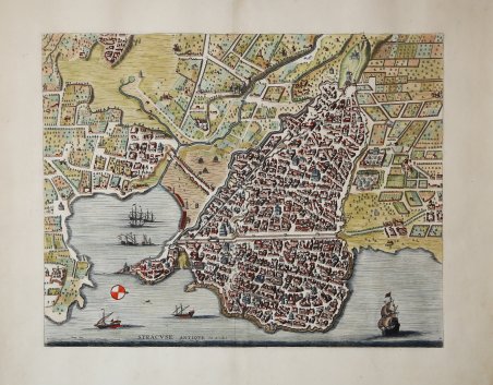 Pianta prospettica della città basata sul modello disegnato da ' Vincenzo Mirabella Alagona. L'opera è per la prima volta pubblicata nel ' Theatrum Civitatum et admirandorum Italiae, ' stampato da Johannes Blaeu ad Amsterdam nel 1663. Esemplare tratto dal ' Nouveau Theatre de l'Italie ' pubblicato ad Amsterdam nel 1704/5 da Pierre Mortier e ristampato da R. Alberts nel 1724. Johannes Blaeu, durante la sua lunga attività editoriale pubblica tre volumi sulle città italiane. Nel 1663 i primi tre, suddivisi in Stato della Chiesa, Roma e Regno di Napoli e Sicilia. Alla sua morte i suoi eredi danno alla luce altri due volumi datati 1682 incentrati sulle città del Piemonte e della Savoia, poi ristampati da altri editori nel 1693 e 1697. ' ' Il francese Pierre Mortier pubblica una ristampa nel 1704/5, intitolata Nouveau Theatre de l’Italie. L’opera è in quattro volumi e comprende le lastre del Blaeu, ritoccate e modificate in piccola parte, integrate dall’aggiunta di numerose nuove mappe di proprio disegno, raffiguranti le città della parte settentrionale della penisola, racchiuse nel primo volume dell’opera. L’atlante del Mortier venne pubblicato con testo latino, francese ed olandese. La particolarità che differenzia le due edizioni di Blaeu e Mortier è rappresentata dal fatto che il testo non è al verso della singola mappa (che quindi è bianca nel retro), ma si trova all’inizio di ogni singolo volume. Il grande successo dell’opera diede origine ad un’ulteriore ristampa, praticamente identica, curata da R. Alberts ed edita nel 1724/5. Le opere tratte dalla prima edizione del Blaeu, 1663, sono caratterizzate dalla presenza del testo al verso, qui assente. Incisione in rame, finemente colorata a mano, in ottimo stato di conservazione. Bibliografia Koeman pp. 332/338, Cremonini pp. 83-90. A bird's-eye view of Siracusa based on the map by Vincenzo Mirabella Alagona. Work first included in ' Theatrum Civitatum et Admirandorum Italiae ad aevi veteris & praesentis temporis faciem expressum à Ioanne Blaeu G. F., ' printed by Johannes Blaeu, Amsterdam, 1663. Example taken from ' Nouveau Theatre de l'Italie ' - Amsterdam nel 1704/5 - by Pierre Mortier or from the da R. Alberts issue (1724). Without descriptive text on the back. The ' Theatrum Civitatum et Admirandorum Italiae ' is the first monumental town book entirely covering Italy, preceded by the "pocket-size" ' Italia Hodierna ' by Jodocus Hondius jr. (1627) and realized in likely competition with Johannes Janssonius who, in 1657, published the ' Theatrum praecipuarum urbium, ' containing a volume dedicated to Italy. Johannes Blaeu, during his long editorial activity published three volumes on Italian cities. In 1663 the first three, divided into the State of the Church, Rome and the Kingdom of Naples and Sicily. At his death his heirs gave birth to two more volumes dated 1682 focused on the cities of Piedmont and Savoy, then reprinted by other publishers in 1693 and 1697. Pierre Mortier publishes a reprint in 1704/5, entitled ' Nouveau Theatre de l'Italie. The work is in four volumes and includes the plates of Blaeu, retouched and modified in small part, supplemented by the addition of several new maps of his own design, depicting the cities of the northern part of the peninsula, enclosed in the first volume of the work. Mortier's atlas was published with Latin, French and Dutch texts. The great success of the work gave rise to a further reprint, virtually identical, edited by R. Alberts and published in 1724/5. Literature C. Barbera Azzarello, "Raffigurazioni ricostruzioni vedute e piante di Palermo", sch. e tav. 42; Koeman pp. 332/338, Cremonini pp. 83-90. Cfr.