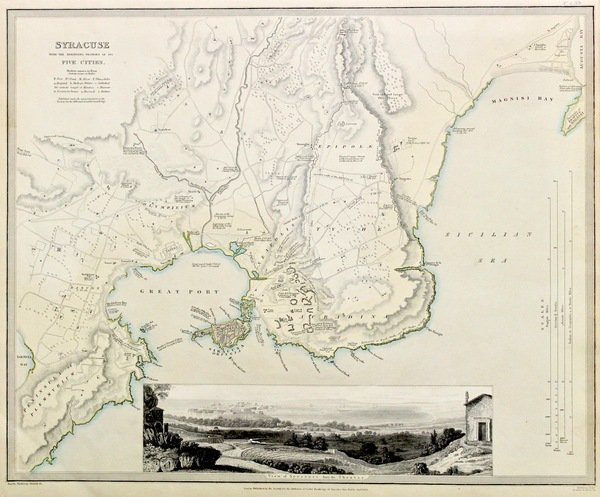 Incisione in acciaio di mm 320x400, dipinta d'epoca ai confini. Bella pianta di Siracusa e dintorni, in basso la veduta della città di mm 65x235. Bell'esemplare in buono stato di conservazione con piccoli strappetti restaurati.