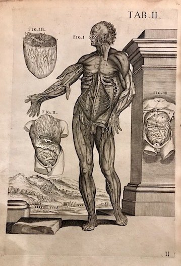 Incisione originale su rame (cm. 25,5x37,5 più margini bianchi) tratta dalle rarissime ‘Tabulae anatomicae’ stampate in prima edizione da Antonio De Rossi ed illustrate con note da Gaetano Petrioli. Carta vergellata. Ottimo stato di conservazione.