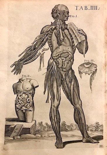 Incisione originale su rame (cm. 25,5x37,5 più margini bianchi) tratta dalle rarissime ‘Tabulae anatomicae’ stampate in prima edizione da Antonio De Rossi ed illustrate con note da Gaetano Petrioli. Carta vergellata con filigrana. Ottimo stato di conservazione.