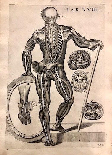 Incisione originale su rame (cm. 25,7x37,5 più margini bianchi) tratta dalle rarissime ‘Tabulae anatomicae’ stampate in prima edizione da Antonio De Rossi ed illustrate con note da Gaetano Petrioli. Carta vergellata con filigrana. Ottimo stato di conservazione.