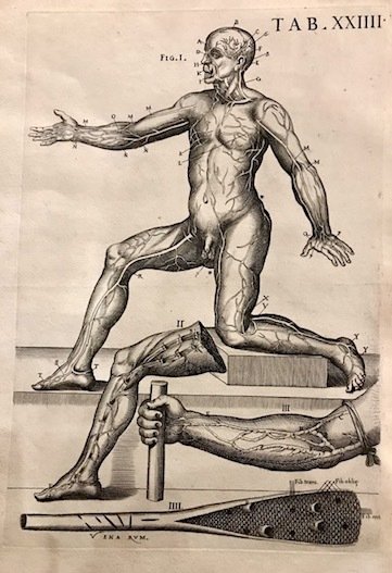 Incisione originale su rame (cm. 25,5x37,5 più margini bianchi) tratta dalle rarissime ‘Tabulae anatomicae’ stampate in prima edizione da Antonio De Rossi ed illustrate con note da Gaetano Petrioli. Carta vergellata con filigrana. Ottimo stato di conservazione.