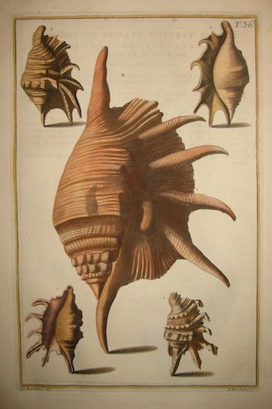 Incisione originale su rame (cm. 23,5x36,5 più ampi margini bianchi) di Antonio Pazzi da un disegno di Giuseppe Menabuoni. Tratta dall’opera ‘Index testarum conchyliorum quae adservantur in Museo Nicolai Gualtieri.’. Bella coloritura all’acquarello. Ottimo esemplare.