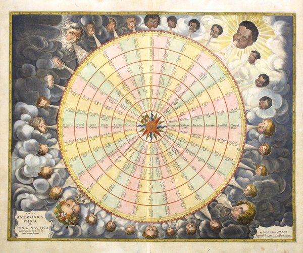 Incisione in rame, dipinta a mano, mm 440x545. La più bella raffigurazione di rosa dei venti pubblicata a stampa, di notevole suggestione, divisa in 32 sezioni. I venti sono raffigurati come putti che soffiano. I nomi dei venti sono ripetuti in olandese, francese, italiano, latino, greco e spagnolo. Tratta dall'atlante marittimo di Janssonius, quinto tomo del suo Atals Major. Ottime condizioni, con minime tracce di sporco superficiale. <BR>Janssonius, genero di Jodocus Hondius e cognato di Henricus Hondius, figlio di Jodocus, collaborò alla pubblicazione di atlanti, dopo l'acquisizione delle lastre di Mercatore da parte di Jodocus e dal 1638 fu in effetti colui che guidò l'impresa editoriale, mentre Henricus Hondius lentamente abbandonava l'attività (dal 1646 il suo nome non apparirà più su alcun frontespizio); divenne così il grande avversario della famiglia Blaeu nel secolo d'oro della cartografia olandese. The most decorative wind chart ever printed; wind heads in successive ages are placed around the compass which is divided into 32 parts and text in six languages. <BR>This chart was published as plate 1 in Jansonnius' 1650 Atlas Maritimus or volume 5 in his Atlantis Majoris. <BR>Jan Jansson or Johannes Janssonius (1588 - 1664) was born in Arnhem, Holland. He was the son of a printer and bookseller and in 1612 married the daughter of Hondius. In 1616 Jansson produced his first maps influenced by Blaeu. In the mid 1630s Jansson partnered with his brother-in-law, Henricus Hondius, to produce his important work, the eleven volume Atlas Major. About this time, Jansson's name also begins to appear on Hondius reissues of notable Mercator/Hondius atlases. <BR>Koeman, C., Atlantes Neerlandici,Me 164, 1. Van der Krogt, P. (Atlantes), volume 1, page 426. Putman, R., Eary Sea Charts, plate 6