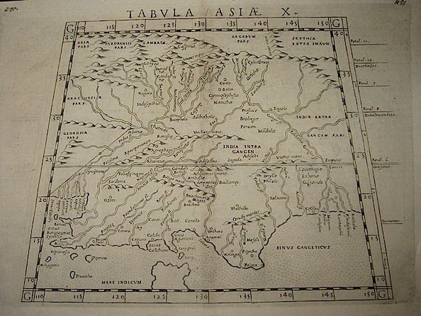 Incisione originale su rame (cm. 26x18,7 più margini bianchi) tratta da ‘La Geografia di Claudio Tolomeo’. Ottimo esemplare.