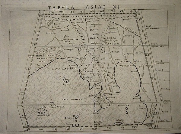 Incisione originale su rame (cm. 26x18,7 più margini bianchi) tratta da ‘La Geografia di Claudio Tolomeo’. Margine inferiore rifilato, ma ottimo esemplare.