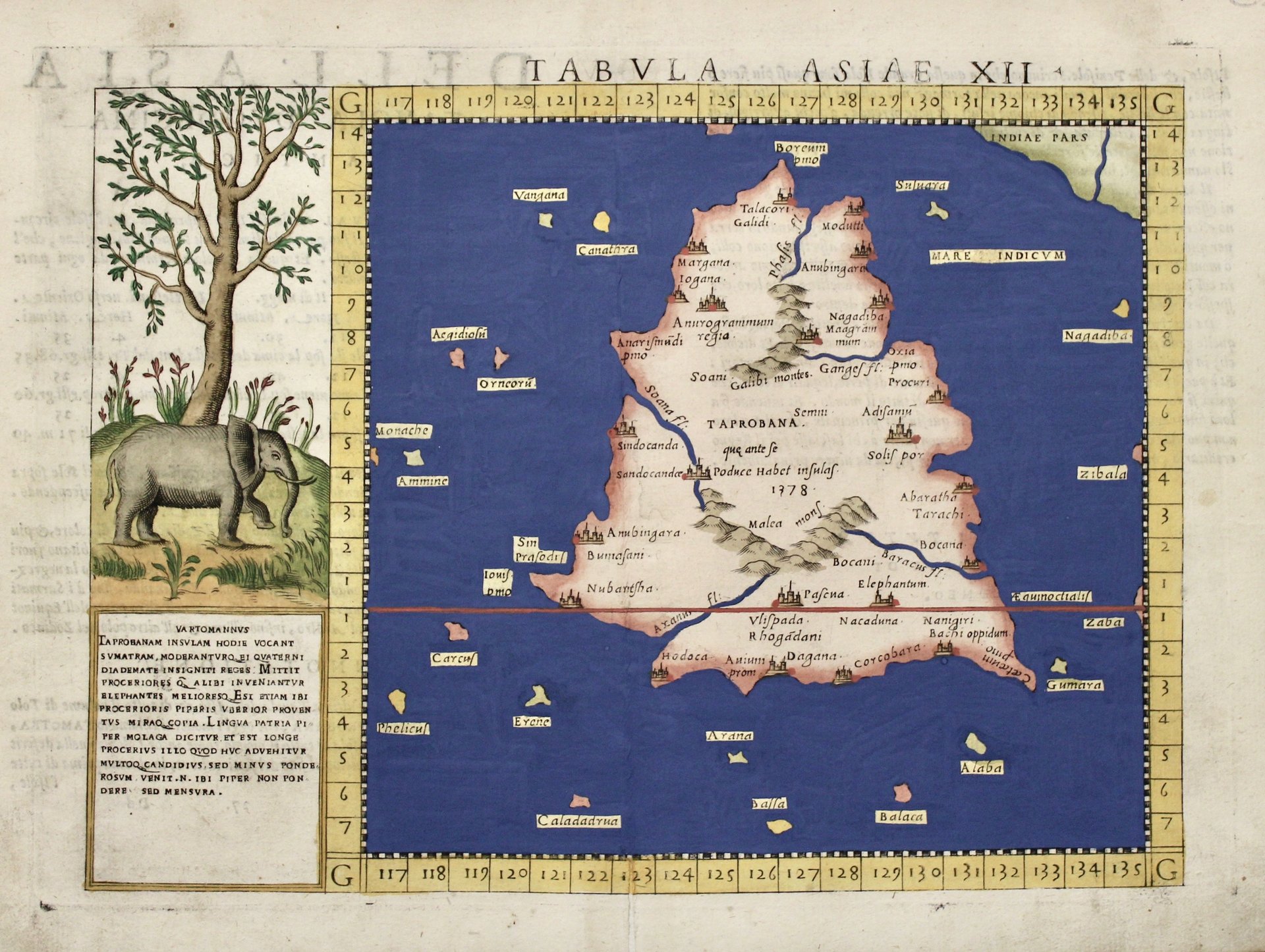 Incisione in rame, dipinta a mano, mm 190x263. Tratta dall'edizione veneziana della "Geographia" di Tolomeo curata da Ruscelli. Si tratta della carta "antica" relativa all' isola di Ceylon, chiamata Taprobana secondo la visione tolemaica, celebre isola delle spezie, importante tappa delle rotte commerciali marittime tra Europa e Asia; al verso testo descrittivo e curioso in italiano, che riporta "Taprobana, che oggi i moderni chiamano Samotra, e dicono essere la maggiore isola di tutto il mondo…". Alcuni studiosi attribuiscono infatti la rappresentazione dell'isola a Sumatra, sia per l'idrografia che per l'orografia e le isole tutte intorno sembrerebbero le odierne Nias, Enggano e Mentawis; altri riferimenti cartografici, come la similitudine della collocazione delle città confermerebbero che si tratti di Sumatra.<BR>Tolomeo, il più grande cartografo dell'antichità, pubblicò La Geografia nel 150 d.C.; nel medioevo sopravvisse, grazie alla mediazione araba, manoscritta in greco e fu poi tradotta in latino da Jacopo D'Angelo; da inizio Quattrocento acquisì sempre più notorietà e nel 1477 fu pubblicata a Bologna la prima edizione illustrata a stampa comprendente solo carte del mondo antico, immediatamente seguita da altre edizioni nel 1478, - 80, - 82 che già presentavano alcune carte del mondo moderno. Con il susseguirsi delle edizioni, si incrementò il numero delle carte moderne consci che il mondo fosse ben diverso da quello di Tolomeo, fino a giungere alla celebre edizione del 1513 di Waldseemueller, il primo atlante moderno, composto da 20 carte nuove oltre alle antiche. Nel corso del XVI secolo ed oltre vennero poi editate numerose edizioni. Girolamo Ruscelli (1500-1566) nasce a Viterbo ed è un importante scrittore ed editore, che dopo aver studiato a Padova trascorse la propria carriera fra Roma e Napoli, dove morì. Ottimo esemplare in fascinosa coloritura in stile tolemaico. € 300 Copperplate engraving, hand-painted, mm 190x263. Taken from the Venetian edition of Ptolemy's "Geographia" edited by Ruscelli. This is the "ancient" map relating to the island of Ceylon, called Taprobana according to the Ptolemaic view, a famous island of spices and an important stop on the maritime trade routes between Europe and Asia; on the verso is a descriptive and curious text in Italian, which states "Taprobana, which today moderns call Samotra, and they say is the largest island in the whole world." Indeed, some scholars attribute the depiction of the island to Sumatra, both in terms of hydrography and orography, and the islands all around would appear to be today's Nias, Enggano and Mentawis; other cartographic references, such as the similarity of the location of the cities would confirm that it is Sumatra.Ptolemy, the greatest cartographer of antiquity, published The Geography in 150 A.D.; in the Middle Ages it survived, thanks to Arab mediation, manuscripted in Greek and was later translated into Latin by Jacopo D'Angelo; from the beginning of the 15th century it gained increasing notoriety and in 1477 the first printed illustrated edition including only maps of the ancient world was published in Bologna, immediately followed by other editions in 1478, - 80, - 82 that already featured some maps of the modern world. With the succession of editions, the number of modern maps increased conscious that the world was quite different from Ptolemy's, leading up to Waldseemueller's famous 1513 edition, the first modern atlas, consisting of 20 new maps in addition to the ancient ones. During the 16th century and beyond, numerous editions were then published. Girolamo Ruscelli (1500-1566) was born in Viterbo and was an important writer and publisher, who after studying in Padua spent his career between Rome and Naples, where he died. Excellent copy in charming Ptolemaic-style coloring.<BR>