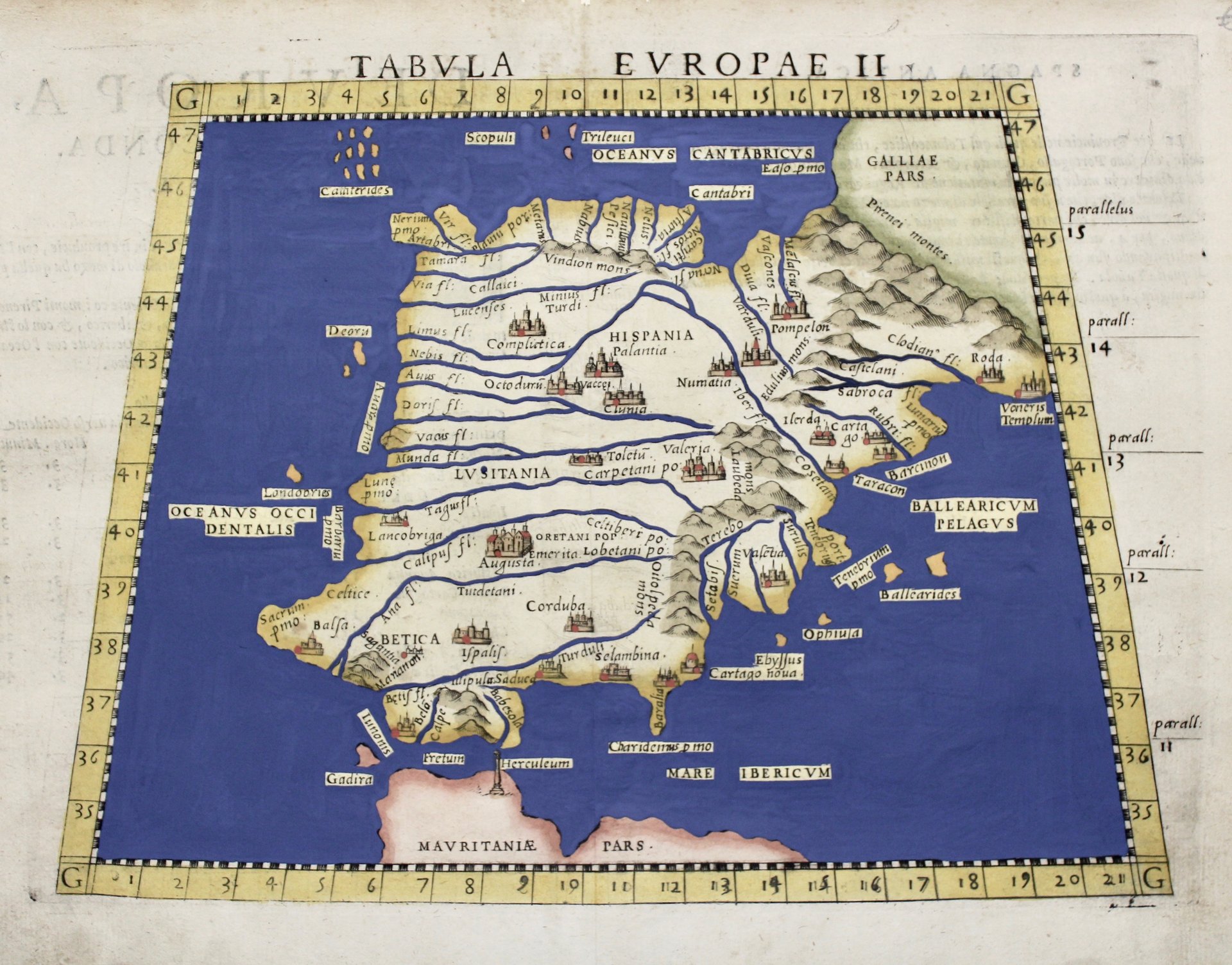 Incisione in rame, dipinta a mano, mm 190x263. Tratta dall'edizione veneziana della "Geographia" di Tolomeo curata da Ruscelli. Si tratta della carta "antica" relativa alla Spagna secondo la visione tolemaica; al verso testo descrittivo e curioso in italiano, che tratta delle tre provincie in cui è suddivisa la Spagna. Tolomeo, il più grande cartografo dell'antichità, pubblicò La Geografia nel 150 d.C.; nel medioevo sopravvisse, grazie alla mediazione araba, manoscritta in greco e fu poi tradotta in latino da Jacopo D'Angelo; da inizio Quattrocento acquisì sempre più notorietà e nel 1477 fu pubblicata a Bologna la prima edizione illustrata a stampa comprendente solo carte del mondo antico, immediatamente seguita da altre edizioni nel 1478, -80, -82 che già presentavano alcune carte del mondo moderno. Con il susseguirsi delle edizioni, si incrementò il numero delle carte moderne consci che il mondo fosse ben diverso da quello di Tolomeo, fino a giungere alla celebre edizione del 1513 di Waldseemueller, il primo atlante moderno, composto da 20 carte nuove oltre alle antiche. Nel corso del XVI secolo ed oltre vennero poi editate numerose edizioni. Girolamo Ruscelli (1500-1566) nasce a Viterbo ed è un importante scrittore ed editore, che dopo aver studiato a Padova trascorse la propria carriera fra Roma e Napoli, dove morì. <BR>Ottimo esemplare in fascinosa coloritura in stile tolemaico. € 300<BR><BR>Incisione in rame, dipinta a mano, mm 190x263. Tratta dall'edizione veneziana della "Geographia" di Tolomeo curata da Ruscelli. Si tratta della carta "antica" relativa alla Spagna secondo la visione tolemaica; al verso testo descrittivo e curioso in italiano, che tratta delle tre provincie in cui è suddivisa la Spagna. Tolomeo, il più grande cartografo dell'antichità, pubblicò La Geografia nel 150 d.C.; nel medioevo sopravvisse, grazie alla mediazione araba, manoscritta in greco e fu poi tradotta in latino da Jacopo D'Angelo; da inizio Quattrocento acquisì sempre più notorietà e nel 1477 fu pubblicata a Bologna la prima edizione illustrata a stampa comprendente solo carte del mondo antico, immediatamente seguita da altre edizioni nel 1478, -80, -82 che già presentavano alcune carte del mondo moderno. Con il susseguirsi delle edizioni, si incrementò il numero delle carte moderne consci che il mondo fosse ben diverso da quello di Tolomeo, fino a giungere alla celebre edizione del 1513 di Waldseemueller, il primo atlante moderno, composto da 20 carte nuove oltre alle antiche. Nel corso del XVI secolo ed oltre vennero poi editate numerose edizioni. Girolamo Ruscelli (1500-1566) nasce a Viterbo ed è un importante scrittore ed editore, che dopo aver studiato a Padova trascorse la propria carriera fra Roma e Napoli, dove morì. <BR>Ottimo esemplare in fascinosa coloritura in stile tolemaico. <BR>