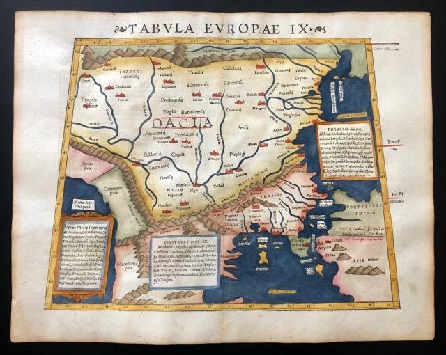 Henri Petri, Basilea, 1541 – 1545. Carta geografica tratta dalla “Geographia Universalis Vetus et Nova Complectens”, edita da H. Petri (realizzata a cura di B. Pirckheimer, Tip. H. Petrum). Incisione su legno, cm 31 x 40 circa (il foglio poiché non è visibile la battuta della lastra). Tavola tolemaica in posizione trapezoidale, inserita nella “Geographia” di Tolomeo e ripresa nell'edizione dello stesso Munster e in alcune edizioni della “Geographia” di Strabone. Titolo in alto, al centro, extra margine, “Tabula Europae IX”; al verso, in grande riquadro riccamente incorniciato da putti alati e festoni, il titolo “Nona Europae Tabula” e la numerazione 11 della pagina, testo latino; margine graduato su tutto il perimetro, senza scale grafiche e senza reticolato. Questa carta fu stampata nel 1541, 1542 e 1545; probabilmente poi nel 1552 e nel 1571; tutte le edizioni furono realizzate a Basilea. Alla sinistra del foglio, in basso, in piccolo riquadro, “Urbes Mysie Superioris”, in un secondo piccolo riquadro, a fianco del primo, più basso e più centrale, “Civitates Daciae”, alla metà del foglio, sulla destra, in piccolo riquadro “Thraciae Civitates”. L'orografia della tavola è rappresentata da coni di talpa (spesso a doppia sommità e con il tratteggio a sinistra), l'idrografia con una doppia riga a decorso arbitrario, la superficie dei mari è tratteggiata; i centri sono indicati con casette; vi sono alcuni limiti territoriali. Molti sono gli errori relativi al territorio. Sebastian Münster (1488 - 1552) è stato uno dei più importanti cartografi tedeschi del secolo XVI. La sua Cosmographia, edita a Basilea nel 1544, rappresenta la prima descrizione tedesca del mondo intero e l’opera principale, dopo la “Cronaca di Norimberga” del 1493, nella rinascita degli studi geografici del XVI secolo in Europa. Titolo e concetto si riallacciano all'opera di Tolomeo, con lo scopo di descrivere tutto il mondo, anche l'America appena scoperta. Münster aveva visitato diversi dei luoghi descritti durante i suoi viaggi, per altri dovette ricorrere a fonti di seconda mano che raccoglieva assiduamente. La “Cosmographia” conteneva non solo le ultime mappe e vedute di tutte le città più famose, ma anche una serie di notizie enciclopediche di dettagli relative al mondo conosciuto e sconosciuto. Dopo la sua morte nel 1552, il figlio Henri Petri continuò la pubblicazione dell’opera. Complessivamente, sono apparse circa 40 edizioni della Cosmographia tra il 1544 e il 1628. Foglio in bella impressione e in buono stato di conservazione. .