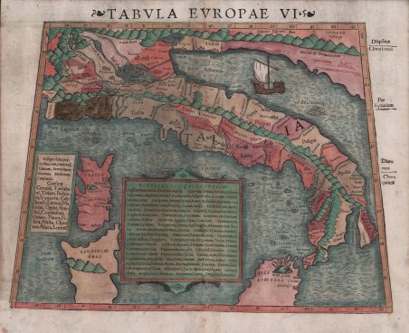 Esemplare finemente colorato d’epoca della mappa di Munster dell'Italia, della Corsica e delle isole vicine, basata sulle informazioni della Geographia di Tolomeo. Carta tratta dalla ' Geographia universalis, vetus et nova, complectens. Claudii Ptolemaei Alexandrini Ennarationis libros VIII, pubblicata per la prima volta nel 1540 a Basilea da Heinrich Petri, figliastro di Münster e suo fidatissimo stampatore. Il volume è illustrato da 27 carte costruite seguendo le indicazioni di Tolomeo, a cui si affiancano 21 carte “moderne”, delineate in base alle recenti scoperte geografiche. La ' Geographia ' di Münster ebbe un notevole successo, e Petri la ristampò l'anno seguente (1541) e quello successivo ancora. Aumentate di sei le carte moderne, tra le quali la ' Carta Marina ' di Olao Magnus descrittiva della Scandinavia, l'editore la ristampò ancora nel 1545, nel 1551 e infine nel 1552, sempre con 54 carte geografiche, ma con la sostituzione della ' Pomerania ' al posto del ' Lago di Costanza. Alla scomparsa di Münster l’opera non venne più ristampata; alcune delle carte furono invece utilizzate da Heinrich Petri per le edizioni postume della ' Cosmographiae Universalis. Le matrici lignee, debitamente emendate, furono poi utilizzate per il ' Rerum Geographicarum ' dello Strabo, edizione stampata a ' Basileae: Ex Officina Henricpetriana, 1571 Mense Augusto. ' Silografia, meravigliosa coloritura coeva, in ottimo stato di conservazione. Esemplare tratto dall’edizione del 1545. Map taken from the Geographia universalis, vetus et nova, complectens. Claudii Ptolemaei Alexandrini Ennarationis libros VIII, published for the first time in 1540 in Basel by Heinrich Petri, stepson of Münster and his trusted printer. Finely original colour example of of Munster's map of Italy, Corsica and neighboring Islands, based on Ptolemy. The book is illustrated by 27 maps built following the indications of Ptolemy, which are flanked by 21 "modern" maps, outlined on the basis of recent geographical discoveries. The Geographia of Münster was a great success, and Petri reprinted it the following year (1541) and then in 1542. Having increased the number of modern maps by six, including the Carta Marina of Olao Magnus describing Scandinavia, the publisher reprinted it again in 1545, in 1551 and finally in 1552, still with 54 maps, but with the substitution of Pomerania in place of Lake Constance. At the death of Münster the work was not reprinted; some of the maps were instead used by Heinrich Petri for the posthumous editions of the Cosmographiae Universalis. The woodblock of the maps, duly amended, were used for the Rerum Geographicarum of Strabo, edition printed in Basileae: Ex Officina Henricpetriana, 1571 Mense Augusto. Woodcut, with fine original colouring, in excellent condition. Example form the 1545 edition. Cfr.