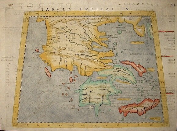 Incisione originale su rame (cm. 26x19 più margini) tratta da ‘La Geografia di Claudio Tolomeo’. Bella coloritura all’acquarello. Ottimo esemplare.