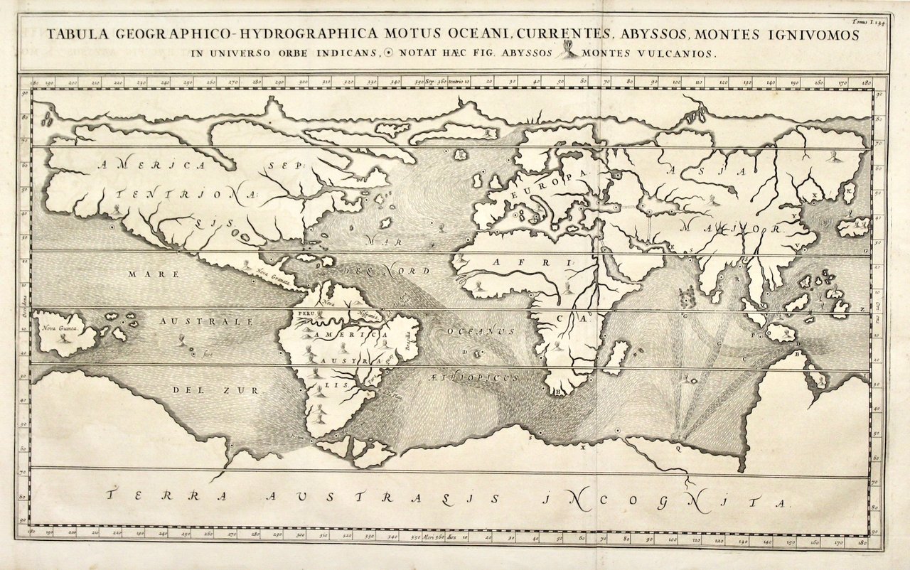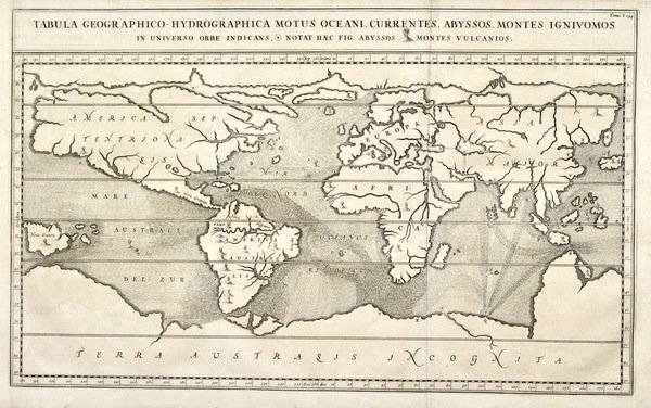 Tabula geographico-hydrographica motus oceani currentes, abyssos, montes igniuomos in universo orbe indicans