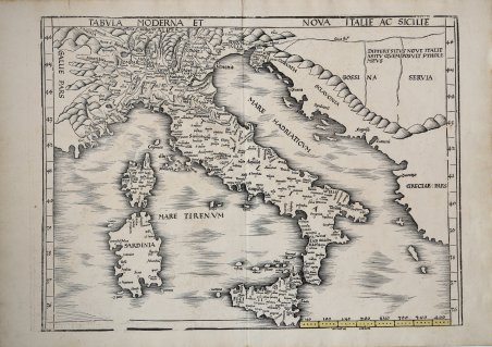Rara ed importante carta della penisola, tratta dalla prima edizione della Geographie Opus Novissima Traductione e Grecorum Archetypis curata dal Waldseemuller ed edita da Johannes Schott nel 1513. L’opera è considerata come il primo atlante moderno, preparato usando la traduzione dal greco di Mathias Ringmann; si tratta di una delle più importanti edizioni del Tolomeo, contenente molte nuove mappe della regioni. Sono 20 le carte aggiunte, basate sulle nuove scoperte e conoscenze, oltre al consueto corpo di 27 carte che compongono la Geografia di Tolomeo, basate sull’atlante edito a Ulm nel 1482. Borri la descrive: “Nell’Italia settentrionale l’orografia risulta assai semplificata; è del tutto inesistente nelle altre parti. I monti non hanno più conformazione a placca lineare ma sono rappresentati da coni accumulati, leggermente arrotondati e con ombra a destra. Le medesime semplificazioni si riscontrano per il sistema idrografico, anch’esso inesistente al centro ed al Sud, con la sola eccezione di un breve tratto del fiume Tevere. La carta deriva da quella del Berlinghieri e perciò in essa è stata introdotta la normale orientazione, con l’eliminazione delle imperfezioni tolemaiche e con l’aggiunta dei nuovi elementi tratti dalle carte nautiche”. Xilografia, scala graduata con lieve coloritura coeva, pieni margini, in straordinario stato di conservazione. Eccellente esemplare di questa rarissima carta della penisola, una delle più importanti rappresentazioni a stampa. Bibliografia: Borri p. 17, 16; Almagià (1927) p. 11b; Perini pp. 22/25. ' A rare and important map of the peninsula, taken from the first edition of the Geographie Opus Novissima Traductione e Grecorum, 1513. The first modern atlas, prepared by Martin Waldseemuller using the translation of Mathias Ringmann. This is one of the most important editions of ptolemy, containing many new regional maps. Twenty new maps based on contemporary knowledge were included in addition to the traditional body of twenty-seven Ptolemaic maps derived from the 1482 Ulm edition. Schott's edition was commenced by the most famous of all early sixteenth-century cosmographers, Martin Waldseemuller and his associate Mathias Ringmann, partly at the expense of Duke Rene of Lorraine. It was brought to completion by Jacobus Eszler and Georgius Ubelin. The atlas contains the first map in an atlas entirely devoted to america (Tabula terre nove), often called the "Admiral's map" after Columbus. The map of Lotharingia (the first map of the Duchy of Lorrain), printed in black, red and olive, is one the earliest examples of colour-printing. This edition was reprinted in 1520 using the same woodcut blocks. Borri: “In Northern Italy orographic is much more simplified and it doesn’t exist in other parts. The mounts have not the linear plate form, but are depictes like a bunch of cones, lightly round with shadow on the right. Extremely simplified also the representation of the hydrographic system especially in the South. The only exception is the course of the Tiber. This map derives from Berlinghieri’s and thus it shows the common orientation, the cancellation of ptolemaic errors and the addition of new elements from sea charts”. Woodcut, light contemporary colour, full margins, in excellent condition. Extraordinary example of a rare map, one of the most important prints ever realized on the peninsula. Literature Borri p. 17, 16; Almagià p. 11b; Perini pp. 22/25. Cfr. Borri p. 17, 16; Almagià p. 11b; Perini pp. 22/25.