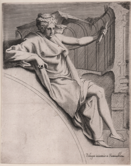 Bulino, 1550 circa; in basso a destra iscrizione: "Bologna inventur a Fonteinebleau". Appartiene alla serie “Le Muse e le tre Grandi Dee”, incisa da Cornelis Bos da disegni di Francesco Primaticcio detto “il Bologna”. Si tratta di copie, in controparte, di incisioni di Leon Davent (1540 – 1550 circa) dagli affreschi di Primaticcio nella Galleria Bassa di Fontainebleau. La musa Talia, appoggiata ad una struttura ad arco, rivolta verso destra e con una pergamena nella mano sinistra. Le dodici Muse e dee adornavano i pennacchi degli archi della Galleria Bassa a Fontainebleau. Non è noto se le figure siano state eseguite a vernice o in rilievo a stucco. I disegni di Primaticcio per la serie si trovano nel Louvre, a parte Euterpe, che si trova nel museo Bonnat-Helleu di Bayonne, ed Erato, ora perso. I tratti di molti dei disegni si adattano perfettamente alle linee incise da Davent, suggerendo che servirono da modello per l’artista. Le incisioni di Davent sono state successivamente copiate da un incisore la cui identità rimane incerta, ma che è stato associato a Cornelis Bos (Schéle, 1965, pp. 206-207, Hollstein Dutch, III, p. 127). Magnifica prova, ricca di toni, impressa su carta vergata coeva priva di filigrana, rifilata al rame o con sottili margini, in eccellente stato di conservazione. Bibliografia Bartsch XVI.315.19; Zerner LD 35; Schéle, 1965, pp. 206-207, nn. 238-49, Hollstein Dutch, III, p. 127, nn. 84-95; C. Jenkins, v. II, LD 35. Engraving, 1550 circa, lettered at bottom right with production line: 'Bologna inventur a Fonteinebleau'. Thalia, leaning against an arched structure, turned to the right, and holding a parchment in the left hand. From a set of twelve, representing the Muses and three goddesses, engraved by Cornelis Bos after Francesco Primaticcio, called “Bologna”. The plates are copies, in reverse of the prints executed by Léon Davent (1540 – 1550 circa) probably engraved after the frescoes executed by Primaticcio in the lower gallery at Fontainebleau. The series depicts the twelve Muses and Goddesses that adorned the spandrels of the arches of the Galerie Basse at Fontainebleau. It is not known whether the figures were executed in paint or stucco relief. Primaticcio's drawings for the series are in the Louvre apart from Euterpe, which is in the Musée Bonnat-Helleu in Bayonne, and Erato, now lost. The engravings on many of the drawings conform closely to the etched lines of Davent's prints, suggesting that they were the models used by the printmaker. Davent's prints were copied by a later etcher, whose identity remains uncertain but who has been associated with Cornelis Bos (Schéle, 1965, pp. 206-207, Hollstein Dutch, III, p. 127). Very good impression, printed with tone on contemporary laid paper without watermark, trimmed to the platemark or with thin margins, very good conditions. Bibliografia Bartsch XVI.315.19; Zerner LD 35; Schéle, 1965, pp. 206-207, nn. 238-49, Hollstein Dutch, III, p. 127, nn. 84-95; C. Jenkins, v. II, LD 35. Cfr.