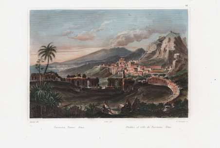 Veduta tratta dal celebre ' L'Italie, la Sicile, les Iles Éoliennes, l'Ile d'Elbe, la Sardaigne, Malte, l'Ile de Calypso etc. D'après les inspirations, les recherches et les travaux de M. M. le Vicomte de Chateaubriand, De Lamartine, Raoul-Rochette, le Comte de Forbin, Piranesi, Mazzara, et de Napoléon, Denon, Saint-Non, Lord Byron, Goethe, Visconti, Cicognara, Lanzi, de Bonstetten, Swinburne, etc. Sites, Monumens, Scènes et Costumes, d'après M.me Haudebourt-Lescot, MM. Horace-Vernet, Granet, Isabey, Ciceri, Mazzara, le Major Light, le Cap. Batty, Cooke, Gell et Gandy, Pinelli, Ferrari, Zucoli, et beaucoup d'autres artistes italiens. Recueillis et publiés par Audot Père, Membre de la Société de Géographie, ' edito a Parigi tra il 1834 ed il 1837 e ristampato a Torino [Giuseppe Pomba e Ca, 1834-1838]. L'opera, in cinque volumi, raccoglie scritti di autori vari, curati da Audot, ed è riccamente illustrata da 324 incisioni su acciaio fuori testo, molte delle quali con accostamento multiplo, per un totale di 473 tavole. Fu notoriamente mastodontico il lavoro cui si sottopose Louis Eustache Audot (1783-1870). View taken from the famous ' L'Italie, la Sicile, les Iles Éoliennes, l'Ile d'Elbe, la Sardaigne, Malte, l'Ile de Calypso etc. D'après les inspirations, les recherches et les travaux de M. M. le Vicomte de Chateaubriand, De Lamartine, Raoul-Rochette, le Comte de Forbin, Piranesi, Mazzara, et de Napoléon, Denon, Saint-Non, Lord Byron, Goethe, Visconti, Cicognara, Lanzi, de Bonstetten, Swinburne, etc. Sites, Monumens, Scènes et Costumes, d'après M.me Haudebourt-Lescot, MM. Horace-Vernet, Granet, Isabey, Ciceri, Mazzara, le Major Light, le Capt. Batty, Cooke, Gell et Gandy, Pinelli, Ferrari, Zucoli, et beaucoup d'autres artistes italiens. Recueillis et publiés par Audot Père, Membre de la Société de Géographie, ' published in Paris between 1834 and 1837 and reprinted in Turin [Giuseppe Pomba e Ca, 1834-1838]. The work, in five volumes, collects the writings of various authors, edited by Audot, and is richly illustrated with 324 engravings on steel outside the text, many of them with multiple combinations, for a total of 473 tables. Louis Eustache Audot (1783-1870) was a notoriously mammoth task. Cfr.