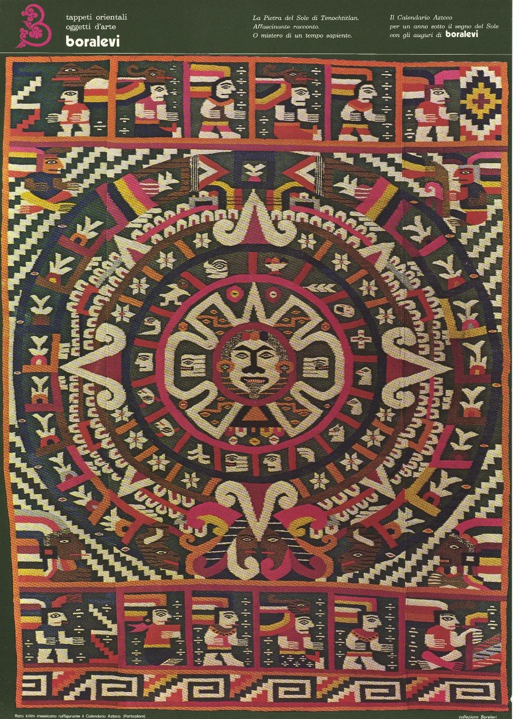 Manifesto originale. Raro kilim messicano raffigurante il Calendario Atzeco (particolare). Testo al retro