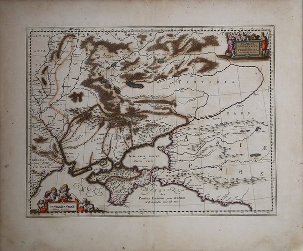 Mappa dettagliata della regione che si estende tra la costa settentrionale del Mar Nero e Mosca. Sono incluse città, paesi, fiumi, montagne, ecc. Due cartigli decorativi.La mappa mostra anche l'Ucraina con l'isola di Crimea. Johannes Janssonius, figlio dell'editore di Arnhem Jan Janssen, sposò Elisabeth Hondius, figlia di Jodocus Hondius, ad Amsterdam nel 1612. Dopo il suo matrimonio, si stabilì in questa città come libraio ed editore di materiale cartografico. Nel 1618 si stabilì ad Amsterdam accanto alla libreria di Willem Jansz. Blaeu, entrando in una seria competizione. Le sue attività non riguardavano solo la pubblicazione di atlanti e libri, ma anche di mappe singole e un vasto commercio di libri con filiali a Francoforte, Danzica, Stoccolma, Copenaghen, Berlino, Koningsbergen, Ginevra e Lione. Nel 1631 iniziò a pubblicare atlanti insieme a Henricus Hondius. Nei primi anni 1640 Henricus Hondius lasciò l'attività di pubblicazione di atlanti completamente a Janssonius. La concorrenza con Joan Blaeu, figlio e successore di Willem, nella produzione di atlanti spinse Janssonius ad ampliare il suo Atlas Novus finalmente in un'opera di sei volumi, in cui furono inseriti un atlante marino e un atlante del Vecchio Mondo. Dopo la morte di Joannes Janssonius, il negozio e la casa editrice furono continuati dagli eredi sotto la direzione di Johannes van Waesbergen (c. 1616-1681), genero di Joannes Janssonius. Le matrici degli atlanti di Janssonius furono in seguito vendute a Schenk e Valck. Detailed map of the region between the northern coast of the Black Sea and Moscow. Shows ports, cities, towns, rivers, mountains, etc. Two decorative cartouches.Map shows the Ukraine with the island of Crimea. Johannes Janssonius (Arnhem, 1588-1664), son of the Arnhem publisher Jan Janssen, married Elisabeth Hondius, daughter of Jodocus Hondius, in Amsterdam in 1612. After his marriage, he settled down in this town as a bookseller and publisher of cartographic material. In 1618 he established himself in Amsterdam next door to Blaeu’s book shop. He entered into serious competition with Willem Jansz. Blaeu. His activities not only concerned the publication of atlases and books, but also of single maps and an extensive book trade with branches in Frankfurt, Danzig, Stockholm, Copenhagen, Berlin, Koningsbergen, Geneva, and Lyon. In 1631 he began publishing atlases together with Henricus Hondius. In the early 1640s Henricus Hondius left the atlas publishing business completely to Janssonius. Competition with Joan Blaeu, Willem’s son and successor, in atlas production prompted Janssonius to enlarge his Atlas Novus finally into a work of six volumes, into which a sea atlas and an atlas of the Old World were inserted. After the death of Joannes Janssonius, the shop and publishing firm were continued by the heirs under the direction of Johannes van Waesbergen (c. 1616-1681), son-in-law of Joannes Janssonius. The copperplates from Janssonius’s atlases were afterwards sold to Schenk and Valck. Cfr.