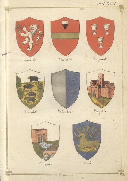 Tavola di stemmi in cromolitografia. N°XLV: Stemmi di Torrita, Travale, Trequanda, Troiola, Valcortese, Vergelle, Vignoni, Vivo. 1880 circa.