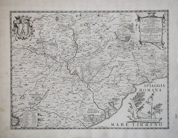Carta geografica tratta dal ' Mercurio geografico overo Guida Geografica in tutte le parti del Mondo conforme le Tavole Geografiche del Sansone Baudran de Cantelli Data in luce con direttione, e cura di Gio. Giacomo de Rossi nella sua stamperia raccolta di carte edita a Roma tra il 1660 ed il 1730 dalla tipografia De Rossi ' - la datazione delle carte va dal 1669 al 1715 - la cui prima stesura si deve a Giovanni Giacomo de Rossi. Nel corso degli anni l’atlante fu arricchito da un numero sempre maggiore di carte nelle successive edizioni curate prima da Domenico de Rossi e poi dal figlio Filippo. Il Mercurio Geografico ' è una raccolta che raccoglie lavori di cartografi quali Michele Antonio Baudrand, Nicolas Sanson, Augustin Lubin, Filippo Titi, Giacomo Ameti, Giovanni Antonio Magini e Innocenzo Mattei e che ' contempla come "corpus" principale ' la grande produzione del geografo Giacomo Cantelli da Vignola. Le carte sono finemente copiate ed intagliate dai maggiori incisori dell'epoca tra i quali Falda, Widman, Barbey, Widman, Lhuillier, Donia, Mariotti. ' Innocenzo Mattei era un monaco camaldolese che fu nominato da papa Clemente X geografo pontificio. Intagliata da Giorgio Widman. Stemma in alto a sinistra, semplice ma bel cartiglio in alto a destra, un grande compasso in basso a destra e sotto il motto “Stipite de nitido terras, mare, sidera librat”; sono segnalati a grandi lettere la Spiaggia romana con Capo D'Anzio e il Mare Tirreno. Incisione in rame, in buono stato di conservazione. Bibliografia cfr. R. Almagià, Studi storici di cartografia napoletana, in “Archivio storico per le province napoletane”, 38 (1913), p. 645; A. Bonazzi, Il Mercurio geografico: il gioco e la differenza, in “Giacomo Cantelli: geografo del Serenissimo”, Bologna, 1995, p. 37-44 e 150-152; Bagrow ' 268; ' Phillips ' I 254-255; Shirley BL I, pp. 868-874; ' Istituto di Studi Romani, a cura di A. Frutaz, "Le Carte del Lazio", XVII.6, tav. 7; Almagià, Documenti cartografici dello Stato Pontificio p. 39. Map taken from Mercurio geografico overo Guida Geografica in tutte le parti del Mondo conforme le Tavole Geografiche del Sansone Baudran de Cantelli Data in luce con direttione, e cura di Gio. Giacomo de Rossi nella sua stamperia collection of maps published in Rome between 1660 and 1730 by the typography De Rossi - the date of the maps goes from 1669 to 1715 - whose first edition is due to Giovanni Giacomo de Rossi. Over the years the atlas was enriched by an increasing number of maps in subsequent editions edited first by Domenico de Rossi and then by his son Filippo. The Mercurio Geografico is a collection that brings together works by cartographers such as Michele Antonio Baudrand, Nicolas Sanson, Augustin Lubin, Filippo Titi, Giacomo Ameti, Giovanni Antonio Magini and Innocenzo Mattei, and which includes as its main "corpus" the great production of the geographer Giacomo Cantelli da Vignola. The maps are finely copied and engraved by the major engravers of the time including Falda, Widman, Barbey, Widman, Lhuillier, Donia, Mariotti. ' Striking and highly detailed map of the region around Rome, engraved by Giorgio Widman and published in Rome by Giacomo Rossi, the most important map maker working in Rome during the second half of the 17th Century. Innocenzo Mattaei was appointed as the official cartographer to the Papal States by Pope Clemente X. The present map was originally prepared by Mattei in 1666 and later engraved by Widman and issued by the Rossi family in their Mercurio Geografico. It represents perhaps the most accurate and detailed map of the region to appear in a commercial atlas of the period and reflects the skill of the engraver and the high quality of engraving work being done in Rome in the second half of the 17th Century, a period during which a new generation of Italian map makers produced a number of decorative and important separately issued maps and atlases at a scale not scene since Lafreri and his contemporaries work in the 1560s and 1570s. Giorgio Widman engraved a number of maps for Rossi from 1672 to 1682. He also appears to have done some work for Guillaume Sanson during the period. Copper engraving, in good condition. Literature cfr. R. Almagià, ' Studi storici di cartografia napoletana, in “Archivio storico per le province napoletane”, 38 (1913), p. 645; A. Bonazzi, ' Il Mercurio geografico: il gioco e la differenza, in “Giacomo Cantelli: geografo del Serenissimo”, Bologna, 1995, p. 37-44 e 150-152; Bagrow ' 268; ' Phillips ' I 254-255; Shirley BL I, pp. 868-874; ' Istituto di Studi Romani, a cura di A. Frutaz, "Le Carte del Lazio", XVII.6, tav. 7; Almagià, Documenti cartografici dello Stato Pontificio p. 39. Cfr.