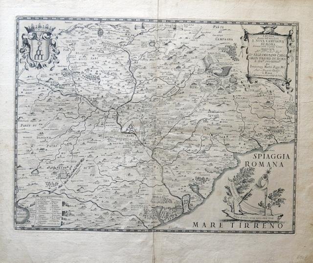 Tavola esatta dell’antico Latio e Nova Campagna di Roma. Situata sotto il quinto clima. Dedicata all’Ill. mo et Ecc. mo Sig.re D. Sigismondo Chigi Gran Priore di Roma e Sig.re Suo Benig.mo. Da Innocenzo Mattei Rom. MC. Aut. E Descrit. Geogr. in Roma nella Stamperia di Giac. De Rossi alla Pace.