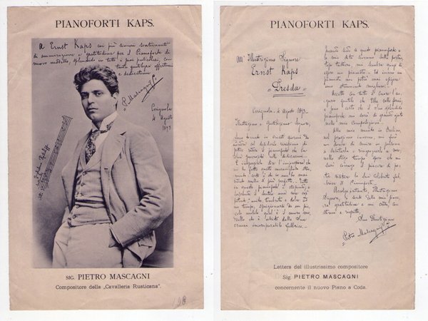 Tavola fuori testo di un libro. PIANOFORTI KAPS - Pietro Mascagni, compositore "Cavalleria Rusticana" 1893