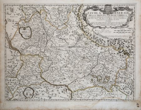 Dettagliata carta geografica dell’Umbria dell’abate Silvestro Amanzio Maroncelli (1652-1719) stampata nel 1712 da Domenico de Rossi e parte del Mercurio Geografico. La graduazione ai margini, per ogni minuto primo, va da 42° 13' a 43° 9' lat. e da 35° 28' a 37° 14' long. Scala in miglia comuni italiane e francesi. “L'abate Moroncelli svolse notevole attività cartografica e globografica (cfr. F. Bonasera, Un cartografo italiano del Seicento: Amanzio Moroncelli, "Bollettino dell'AIC", 1978, n. 43, pp. 51-55). A lui si devono due importanti carte del territorio anconetano-fermano e dell'Umbria di cui si conservano esemplari, in scala 1:255.000, nella cartoteca storica dell'I.G.M.I. (Firenze). Di ragguardevoli dimensioni, la carta rappresenta la Provincia dell'Umbria quale entità amministrativa dello Stato Pontificio ma anche la parte settentrionale del Viterbese e della Sabina e lembi dei territori confinanti (Ducato di Urbino, Granducato di Toscana, Marca di Ancona e parte dell'Abruzzo). Come osserva l'Almagià (Documenti Cartografici Stato Pontificio, p. 38, tav. LXIV), che l'apprezza alquanto pur nella sua dichiarata non originalità, fonti iconografiche per la tavola furono le carte regionali inserite nei noti atlanti maginiani e mercatoriani; tuttavia, rispetto ai prototipi l'Autore amplia notevolmente la porzione di territorio considerata unificando i vari dati cartografici e introducendo alcune correzioni. La tavola si segnala per l'accuratezza formale e per la ricchezza di contenuti, anche se, in uno dei primi commenti espressi nei riguardi di questa carta (R. Riccardi, La Cartografia della Sabina, "Terra rap- Sabina", n. 5, 1925, p. 149), «il rilievo continua ad essere totalmente arbitrario». Ciò ammesso, si deve però riconoscere l'accurata presentazione idrografica. A tal riguardo, non riportato in altre carte, il tratto della Valle del Nera compreso tra Arrone e la Cascata delle Marmore è denominato Val Soppenga: nome dato anticamente alla parte della Valle del Nera, appunto da Arrone in giù, oggi detta della Valnerina (v. L. Fausti, I Castelli e le Ville dell'antico contado e distretto della città di Spoleto, Perugia 1993, pp. 142-143). Le località riportate sono molto numerose cosicché la carta risulterebbe utile per ricerche sulle sedi umane scomparse; nel repertorio delle carte del succitato I.G.M.I. si dice «gli abitati sono rappresentati con torri o case o con circolini e distinti secondo la loro importanza; tracciata la rete stradale» (compare in effetti un disegno piuttosto preciso della principale rete viaria). Al centro della carta, a indicare il bacino di Assisi-Foligno-Spoleto risulta ancora la scritta Valle Spoletana, una denominazione che di rado è dato leggere e che poté affermarsi grazie all'importanza della città che un tempo fu capitale dell'antico Ducato” (cfr. Le antiche terre del Ducato di Spoleto, p. 148). “In un elegante cartiglio, ornato a volute e festoni di fiori, con al centro uno stemma sormontato da cappello vescovile, il titolo "Tavola Generale della Provincia dell'Umbria Nuovamente Corretta et Ampliata, secondo lo stato presente dal Rev. mo Padre Abb. Moroncelli Monaco Silvestrino da Fabriano, Data in luce da Domenico de Rossi." segue la dedica a monsignor Scipione de Ricci. Sotto al cartiglio, circondate da un nastro intrecciato, la legenda dei simboli topografici, la scala di 10 miglia comuni d'Italia pari a mm 71, di 4 leghe comuni di Francia pari a mm 76 e la firma dello stampatore "In Roma nella stamperia di Domenico de Rossi erede di Gio. Giacomo alla Pace con privilegio del Som. Pont. e Lic. de Sup. l'anno 1712". Tratta dal "Mercurio Geografico overo guida geografica in tutte le parti del mondo, Conforme le tavole geografiche del Sansone Baudrand e Cantelli." pubblicato a Roma dalla Stamperia de Rossi in varie edizioni tra il 1680 circa ed il 1739 circa. Margini graduati, carta senza orientazione. La carta del Moroncelli abbraccia un territ. Dettagliata carta geografica dell’Umbria dell’abate Silvestro Amanzio Maroncelli (1652-1719) stampata nel 1712 da Domenico de Rossi e parte del Mercurio Geografico. La graduazione ai margini, per ogni minuto primo, va da 42° 13' a 43° 9' lat. e da 35° 28' a 37° 14' long. Scala in miglia comuni italiane e francesi. “L'abate Moroncelli svolse notevole attività cartografica e globografica (cfr. F. Bonasera, Un cartografo italiano del Seicento: Amanzio Moroncelli, "Bollettino dell'AIC", 1978, n. 43, pp. 51-55). A lui si devono due importanti carte del territorio anconetano-fermano e dell'Umbria di cui si conservano esemplari, in scala 1:255.000, nella cartoteca storica dell'I.G.M.I. (Firenze). Di ragguardevoli dimensioni, la carta rappresenta la Provincia dell'Umbria quale entità amministrativa dello Stato Pontificio ma anche la parte settentrionale del Viterbese e della Sabina e lembi dei territori confinanti (Ducato di Urbino, Granducato di Toscana, Marca di Ancona e parte dell'Abruzzo). Come osserva l'Almagià (Documenti Cartografici Stato Pontificio, p. 38, tav. LXIV), che l'apprezza alquanto pur nella sua dichiarata non originalità, fonti iconografiche per la tavola furono le carte regionali inserite nei noti atlanti maginiani e mercatoriani; tuttavia, rispetto ai prototipi l'Autore amplia notevolmente la porzione di territorio considerata unificando i vari dati cartografici e introducendo alcune correzioni. La tavola si segnala per l'accuratezza formale e per la ricchezza di contenuti, anche se, in uno dei primi commenti espressi nei riguardi di questa carta (R. Riccardi, La Cartografia della Sabina, "Terra rap- Sabina", n. 5, 1925, p. 149), «il rilievo continua ad essere totalmente arbitrario». Ciò ammesso, si deve però riconoscere l'accurata presentazione idrografica. A tal riguardo, non riportato in altre carte, il tratto della Valle del Nera compreso tra Arrone e la Cascata delle Marmore è denominato Val Soppenga: nome dato anticamente alla parte della