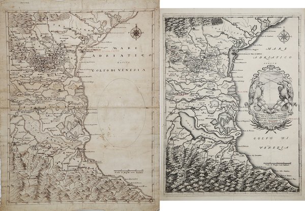 Manoscritto preparatorio, e prova di stampa (con numerosi toponimi manoscritti ad inchiostro rosso che poi saranno presenti nella stesura definitiva della carta, e alcune correzioni) della carta del Padovano, Polesine e Romagna che il Vandelli prepara per l’editore Soliani. La mappa è poi inserita nella pù bella edizione illustrata del poema di Alessandro Tassoni, La Secchia Rapita, edito a Modena nel 1744. L’opera è incisa da Alessandro Bolzoni. (Ferrara 1689-1760). Dimensioni 455x365 circa ognuno.Opere in perfetto stato conservativo.Rarissimo documento cartografico. Manoscritto preparatorio, e prova di stampa (con numerosi toponimi manoscritti ad inchiostro rosso che poi saranno presenti nella stesura definitiva della carta, e alcune correzioni) della carta del Padovano, Polesine e Romagna che il Vandelli prepara per l’editore Soliani. La mappa è poi inserita nella pù bella edizione illustrata del poema di Alessandro Tassoni, La Secchia Rapita, edito a Modena nel 1744. L’opera è incisa da Alessandro Bolzoni. (Ferrara 1689-1760). Dimensioni 455x365 circa ognuno.Opere in perfetto stato conservativo.Rarissimo documento cartografico. Cfr. Z. Davoli, R. Sanfelici, S. Zanasi, Terre di Langobardia, p. 268, 131B; Faini - Majoli, La Romagna nella Cartografia a stampa, p. 120, 60; A. Alberghini, Ferrara, la storia del territorio in una collezione di mappe e vedute dal XV al XX secolo, p.70.