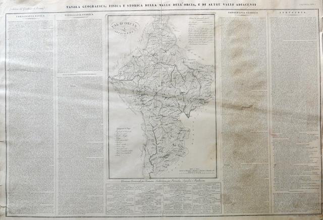 Firenze, Stamperia Granducale, 1831. Dall' “Atlante geografico, fisico e storico del Granducato di Toscana”, incisione in rame all'acquaforte, b/n, cm 53,5 x 76 circa (il foglio). Contiene al centro la carta del territorio descritto, e intorno, suddiviso in quattro colonne, il testo con la sua descrizione fisica, storica e industriale. Ingiallimento nella parte destra del foglio (che interessa la prima colonna di testo), una mancanza all'angolo inferiore destro, piccoli strappi e difetti ai margini.