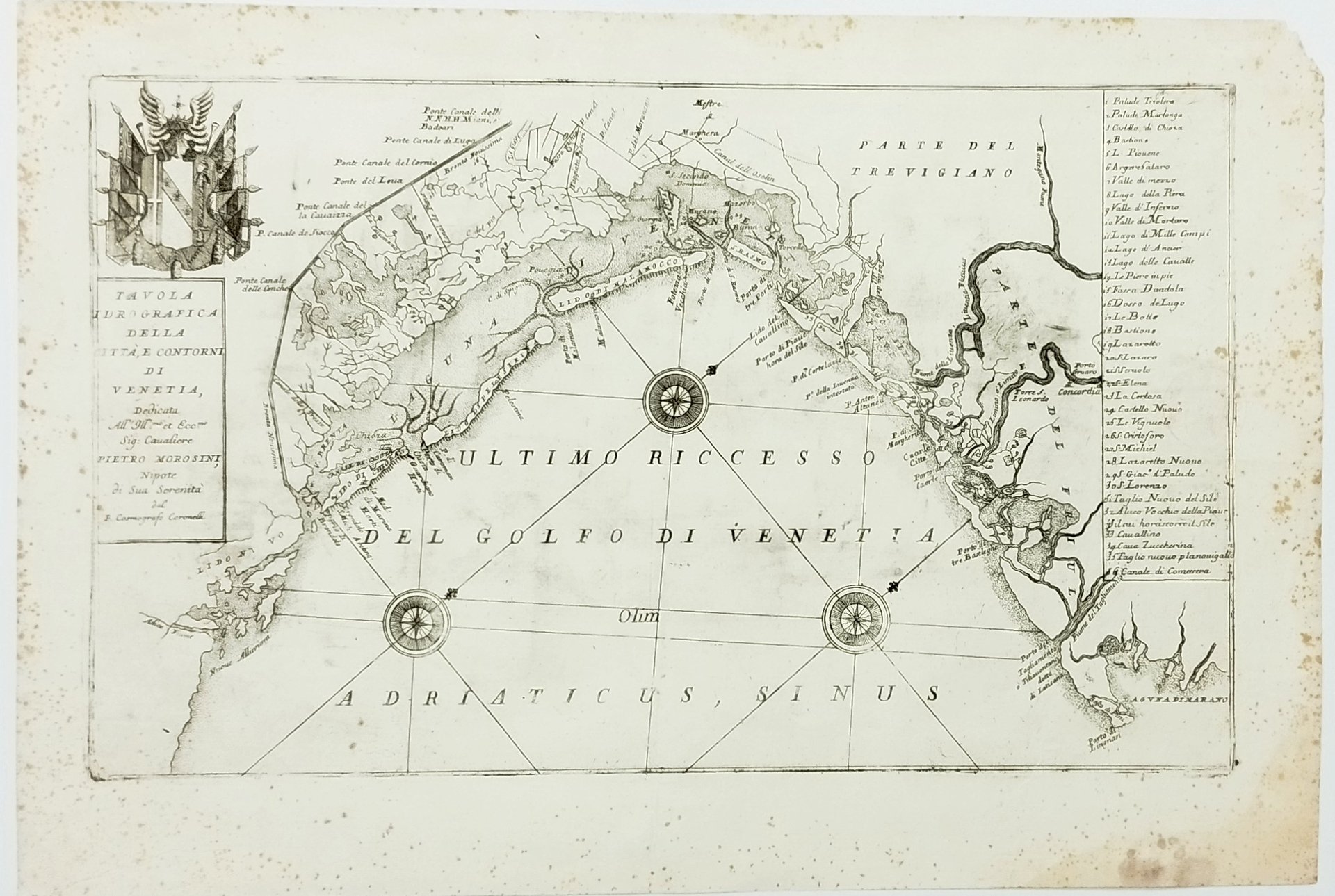 Incisione calcografica di mm 432 x 270 alla battuta, su foglio di carta di filo veneziana di mm 490 x 339. Diffuse fioriture esterne al margine della incisione. Dedica del foglio al Cavalier Pietro Morosini. Foglio proveniente dall'opera "Città, fortezze, isole, e porti principali dell' Europa in pianta, et in elevatione, descritte e publicate ad uso dell' Accademia Cosmografica degli Argonauti" stampato a Venezia nel 1689. La tavola rappresenta il Golfo di Venezia con tre rose dei venti e la Laguna con un buon dettaglio topografico. Sulla sinistra un elenco dei luoghi lagunari con 36 toponimi. Armao 1950, n. 48. (EN) Intaglio engraving measuring 432 x 270 mm at the edge, on a sheet of Venetian thread paper measuring 490 x 339 mm. Diffuse external foxing on the margin of the engraving. Dedication of the sheet to Cavalier Pietro Morosini. Sheet from the work "Cities, fortresses, islands, and main ports of Europe in plan, et in elevation, described and published for the use of the Cosmographic Academy of the Argonauts" printed in Venice in 1689. The plate represents the Gulf of Venice with three compass roses and the Lagoon with good topographic detail. On the left a list of lagoon places with 36 toponyms. Armao 1950, n. 48.