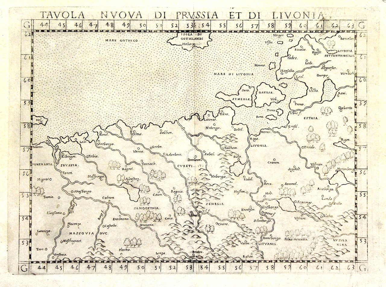 Copper engraving, italian text, mm 194x265 (platemark), from the Ptolemy's "Geographia" edition by Ruscelli. Shows part of Poland from the Vistola to Estonia including all the Baltic states (Vilna is in center of the map). Good condition. Jäger, Prussia-Karten 1542-1810, Nr. 5 (State with at top "Isola di Gothlandi"); <BR>