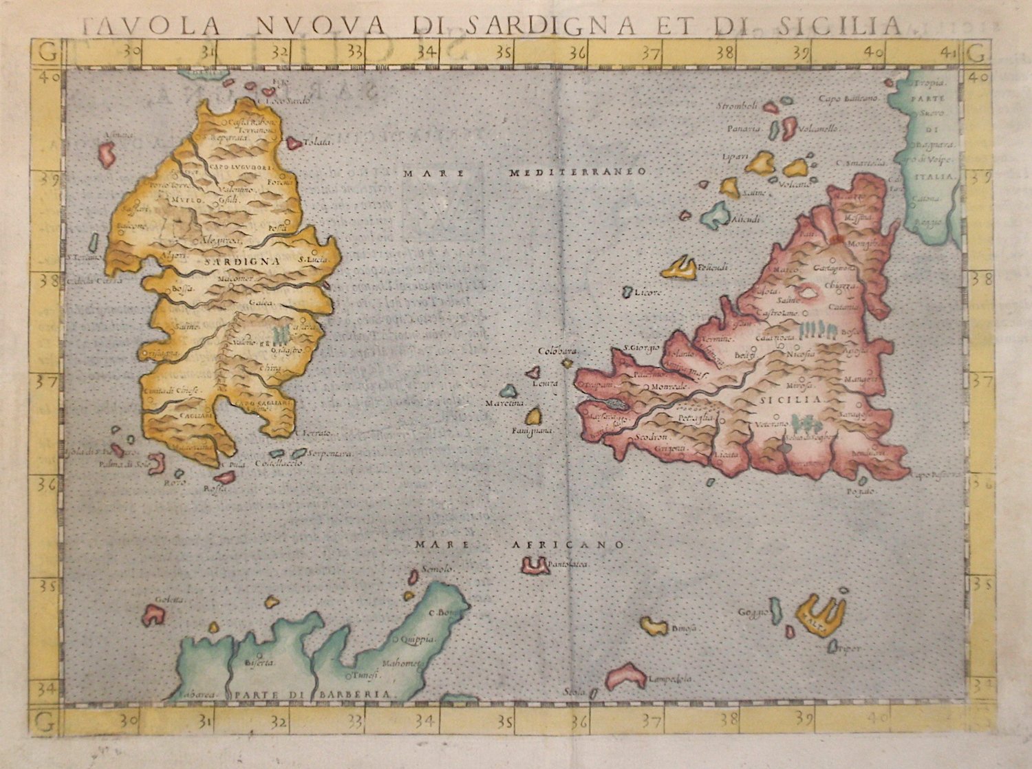 Incisione in rame, colorata a mano, mm 190x263, tratta dall'edizione veneziana della "Geographia" curata da Ruscelli. Buon esemplare, con qualche minima piega.<BR>