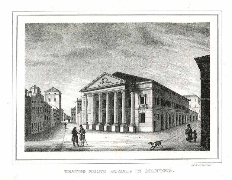 Veduta, antica ed originale, della facciata e di un lato del teatro. Tratta dall'opera "Lombardia Pittoresca / o / Disegni di ciò che la Lombardia chiude di più interessante / per le arti, la storia, la natura / levati dal vero / da / Giuseppe Elena", descritta da Cesare Cantù e Michele Sartorio. Pubblicata a Milano Antonio Fortunato Stella e Figli. Autore: Elena Giuseppe dis. & Guarisco lit. Luogo: Mantova. Anno: 1836. Tecnica: litografia. Dimensioni: 157x217 mm