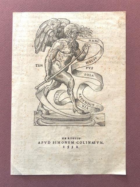 Parisiis, apud Simonem Colinaeum, 1532. Incisione in rame all’acquaforte, b/n, cm 14,5 x 20,5 circa (il foglio). Si segnalano diverse varianti di marche tipografiche molto simili a questa e con lo stesso motto. Frontespizio inciso dell'opera di Claudio Galeno (Claudius Galunus) “Claudij Galeni Pergameni De ratione curandi ad Glauconem libri duo, interprete Martino Acakia catalaunensi, doctore medico. Eiusdem interpretis in eosdem libros Commentarij” (con editore Simon de Colines e traduttore Martin Akakia). Di anonimo incisore, l’immagine è una allegoria del tempo nelle vesti di un vecchio con ali, falce e piedi di capra e con motto “Hanc aciem sola retundit Virtus”, letteralmente “Questa linea è battuta solo dalla Virtù”, a significare che il tempo e la vecchiaia sono vinti solo dalla virtù. Foglio rifilato ai margini, una parte testuale al verso, discreta conservazione.