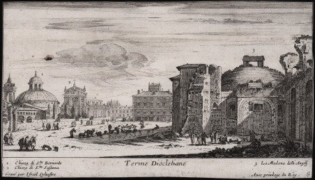Veduta tratta dalla serie ' Vues de Rome et de Venise. “Suite de 12 pièces numérotées au bas, à droite. Cette suite est de la plus belle manière de Silvestre. On en connaît deux états.” (cfr. Faucheux, Catalogue raisonné de toutes les estampes qui forment l'oeuvre d'Israel Silvestre). Il Silvestre, incisore e disegnatore, nasce a Nancy nel 1621. Come era consuetudine all'epoca, fece diversi viaggi in Italia per copiare i vecchi maestri e per migliorare le sue abilità con i più grandi maestri. Faucheux fissa le date di questi viaggi, il primo prima del 1640 (Israel non aveva ancora 20 anni), il secondo dal 1643 al 1644 e l'ultimo intorno al 1653. Israel portò con sé molte vedute dell'Italia, quasi tutte incise. Fino al 1659, fece altri viaggi in Francia e in Lorena, da cui trasse molti disegni e incisioni. Il suo stile fu, all'inizio, piuttosto sciolto, ma dal 1643 in poi divenne più raffinato e delicato, acquisendo accuratezza e precisione senza essere asciutto, risultando a volte simile a quello di Jacques Callot o di Stefano della Bella, con i quali ebbe rapporti di amicizia attraverso il suo zio materno e mentore, l’editore Israël Henriet. Accanto alle testimonianze per la Roma antica mostrò ben presto un grandissimo interesse per la città "moderna", divenendo uno dei precursori del vedutismo - non solo nel campo incisorio - anticipando artisti come Lievin Cruyl e Gaspar van Wittel. È praticamente impossibile fare un inventario completo delle opere di Israël Silvestre, tanto era prolifico l'artista. Ha lasciato numerosi disegni e più di mille incisioni. Tra le sue opere più belle, possiamo tuttavia menzionare le numerose e complesse “piccole” suite (composte da poche tavole) sulle piazze, le chiese e le antichità di Roma. Acquaforte, in ottimo stato di conservazione. Bibliografia L. E. Faucheux, Catalogue raisonné de toutes les estampes qui forment l'oeuvre d'Israel Silvestre: précédé d'une notice sur sa vie (1857), n. 4.6; F. Baré, Israël Silvestre et sa famille, suivi du catalogue de son oeuvre (1885), n. 833. View taken from the series ' Vues de Rome et de Venise “Suite de 12 pièces numérotées au bas, à droite. Cette suite est de la plus belle manière de Silvestre. On en connaît deux états.” (cfr. Faucheux, Catalogue raisonné de toutes les estampes qui forment l'oeuvre d'Israel Silvestre). Silvestre, engraver and draftsman, was born in Nancy in 1621. As was customary at the time, he made several trips to Italy to copy the old masters and to improve his skills with the greatest masters. Faucheux fixes the dates of these trips, the first before 1640 (Israel was not yet 20 years old), the second from 1643 to 1644 and the last around 1653. Israel brought with him many views of Italy, almost all of them engraved. Until 1659, he made other trips to France and Lorraine, from which he took many drawings and engravings. His style was, at the beginning, rather loose, but from 1643 onwards became more refined and delicate, acquiring accuracy and precision without being dry, resulting sometimes similar to that of Jacques Callot or Stefano della Bella, with whom he had friendly relations through his maternal uncle and mentor, the publisher Israël Henriet. Alongside the testimonies to ancient Rome, he soon showed great interest in the "modern" city, becoming one of the precursors of vedutism - not only in the field of engraving - anticipating artists such as Lievin Cruyl and Gaspar van Wittel. It is quite impossible here to make a complete inventory of Israël Silvestre's works, so prolific was the artist. He left numerous drawings and more than a thousand engravings. However, among his most beautiful works, we can mention the many complex "small" suites (composed of a few plates) on the squares, churches and antiquities of Rome. Etching, in excellent condition. Bibliografia L. E. Faucheux, Catalogue raisonné de toutes les estampes qui forment l'oeuvre d'Israel Silvestre: précédé d'une notice sur sa vie (1857), n. 4.6; F. Baré, Israël Silvestre et sa famille, suivi du catalogue de son oeuvre (1885), n. 833. Cfr.