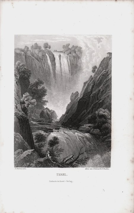 Veduta della città tratta da ' Pittoreskes Italien ' di Carl Frommel, edito a Lipsia nel 1840.Pittore e incisore di Scuola tedesca. Dopo aver visitato l’Italia, si ferma in Germania e diventa professore di pittura e di incisione a Carlsruhe. In seguito, si reca in Inghilterra dove apre un atelier di incisione.Incisione in rame, in ottimo stato di conservazione. View of the city from ' Pittoreskes Italien ' by Carl Frommel, published in Leipzig in 1840. Painter and engraver of the German School. After visiting Italy, he stayed in Germany and became professor of painting and engraving in Carlsruhe. He then went to England where he opened an engraving studio. Copperplate, in excellent condition. Cfr.