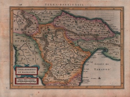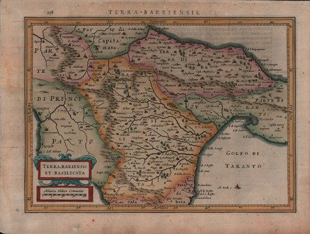 Carta tratta dal ' Nova et accurata Italiae hodiernae descriptio in qua omnium eius regionum, vrbium, pagorum, dominiorum, castellorum, montium, fluviorum, fontium, lacuum, et portuum, historia exhibetur. Geographicis tabulis et vrbium praecipuarum iconibus illustrata a Iudoco Hondio addita est Siciliae, Sardiniae, Corsicae, et itinerariorum per Italiam brevis delineatio, stampato a Leida dalla tipografia Elzevir nel 1627. Si tratta di un atlante geografico unito ad una raccolta di cartografia urbana, esclusivamente dedicato alla penisola. ' ' L’opera consta di 31 carte geografiche e 67 vedute o piante di città. Le carte derivano dall’Atlas Minor ' del Mercator, mentre la cartografia urbana è basata sui modelli introdotti a Venezia da Francesco Valegio e da quelli del ' Civitates Orbis Terrarum ' di G.Braun e F. Hogenberg. L’opera è relativa al periodo in cui Jodocus Hondius II si era appena diviso dal fratello Hendrick. Secondo la letteratura esisterebbe una prima edizione della raccolta, stampata ad Amsterdam nel 1626. Incisione in rame, finemente colorata a mano, in ottimo stato di conservazione. ' Bibliografia Cremonini, pp. 23/25, n. 18; Fossati Bellani; n. 320; Willems; n. 279. ' Map taken ' from Nova et accurata Italiae hodiernae descriptio in qua omnium eius regionum, vrbium, pagorum, dominiorum, castellorum, montium, fluviorum, fontium, lacuum, et portuum, historia exhibetur. Geographicis tabulis et vrbium praecipuarum iconibus illustrata a Iudoco Hondio addita est Siciliae, Sardiniae, Corsicae, et itinerariorum per Italiam brevis delineatio, printed in Leiden by the printing house Elzevir in 1627. This is a geographical atlas combined with a town book, exclusively dedicated to Italy. ' ' The work consists of 31 maps and 67 views or plans of cities. The maps derive from Mercator's ' Atlas Minor, ' while the plans are based on the models introduced in Venice by Francesco Valegio and those of ' Civitates Orbis Terrarum ' by G. Braun and F. Hogenberg. The work is related to the period in which Jodocus Hondius II had just separated from his brother Hendrick. According to the literature there is a first edition of the collection, printed in Amsterdam in 1626. Copper engraving, finely hand-colored, in excellent condition. Literature Cremonini, pp. 23/25, n. 18; Fossati Bellani; n. 320. Willems; n. 279. ' Cfr.