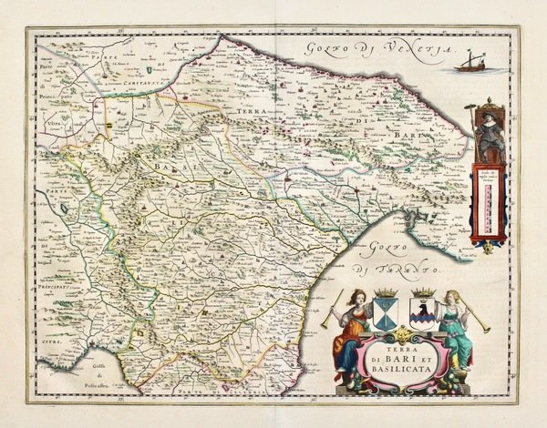 Incisione in rame, finemente colorata a mano, di mm 385x500. Due bei cartigli figurati. Al verso del foglio, testo spagnolo relativo alla carta. W. Blaeu, astronomo allievo di Tycho Brahe, fondò un'officina per la costruzione di globi nel 1599; quasi immediatamente iniziò a pubblicare anche carte geografiche, giungendo nel 1630 alla creazione del primo atlante "Atlantis Appendix" e cinque anni dopo, della prima edizione in due tomi del "Atlas Novus". Dopo la sua morte, avvenuta nel 1638, nel 1662, a cura del figlio Johan, si giunse alla pubblicazione del celebre "Atlas Maior" in 11 volumi. Nel 1672 un incendio distrusse l'officina e segnò la fine dell'attività. Splendido esemplare, a pieni margini, con minimi strappetti al margine sinistro.