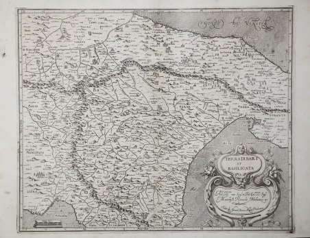 In basso a destra, nel cartiglio, troviamo il titolo TERRA DI BARI ET BASILICATA e la dedica All’ Ill.mo mio Sig.r et P[ad]ro[ne] Col.mo Il Sig.r Marchese Hercole Malvezzi &c. Fabio di Giovanni Antonio Magini Padovano. A sinistra la scala grafica Miglia dieci (10 miglia pari a mm 40). Orientazione nei quattro lati al centro con il nome dei punti cardinali Septentrio, Meridies, Oriens, Occidens, il nord in alto. Graduazione ai margini di 1’ in 1’ da 39° 56’ a 41° 18’ 20’’ di latitudine, e da 38° 28’ 20’’ a 40° 43’ di longitudine. ' La carta della Terra di Bari e della Basilicata di Magini si basa, come fa notare Almagià, essenzialmente sull’Atlantino manoscritto di Niccòlo Antoni Stigliola e Mario Cartaro. Scrive Almagià: “La fonte principale che il Magini ha — direttamente o indirettamente —utilizzato è una carta ufficiale del Reame di Napoli, eseguita dallo studioso nolano Niccolò Antonio Stigliola o Stelliola (1547-1623) in un lungo volger d’anni, certo tra il 1583 e il 1594, con l’aiuto anche del cartografo viterbese Mario Cartaro. La prima notizia di questo lavoro si ha da una lettera dello Stigliola stesso all'Ortelio in data 16 giugno 1588, nella quale costui scriveva che aveva sperato di potergli mandare la corografia del Reame di Napoli, che doveva esser finita presto “sed communi quadam rerum calamitate concidit, praeterito iam quinquennio”; dalle quali ultime parole si ricava che lo Stigliola attendeva a quest’opera per lo meno dal 1583, ma non risulta che avesse allora un incarico governativo. Ma nel maggio 1591 troviamo lo Stigliola insieme con Mario Cartaro occupati a ' riconoscere la descrittione del Regno, ' mediante un viaggio di due mesi, per il quale entrambi ricevono una indennità speciale. Anzi il Cartaro sin dal novembre 1590 si trova impiegato presso la Regia Corte con l’incarico di ' disegnare e ponere in pianta qualsivoglia silo e pianta del Regno; dal 1593 egli figura poi tra gli ingegneri della Regia della Corte, lo Stigliola tra gli ingegneri municipali, come successore di Pompeo Basso. Nel 1595 lo Stigliola perde l’ufficio, perché, accusato di idee eretiche, è incarcerato dal Sant’Uffizio a Roma e sottoposto a processo. […] A noi rimangono una carta generale del Regno di Napoli, misurante cm. 69.2 X 40.3 e dodici cartine delle singole province — tutte a un dipresso dello stesso formato (circa cm. 51 X 36) e alla stessa scala e perciò formanti nell' insieme una carta unica — manoscritte, a colori, con la firma ' Mario Cartaro F. 1613 ' conservate in un volumetto della Biblioteca Nazionale di Napoli. La data tarda, e meglio altri caratteri già altrove segnalati, ci attestano che si tratta di una copia o comunque di una derivazione. […] La rappresentazione dell'Italia meridionale offertaci dalle dodici cartine costituisce sotto ogni riguardo e per ogni elemento un progresso così enorme rispetto a tutti i prodotti precedenti, che non trova spiegazione se non, appunto, nella considerazione che si tratta lavoro eseguito in lungo periodo di tempo, da persone di particolare competenza, e per incarico governativo. Ora è certo che il Magini ebbe sott'occhio i materiali derivanti da questo lavoro cosa pregevole […] la grandissima somiglianza con l’Atlantino napoletano del Cartaro, sia nel disegno dei contorni, sia nella rete idrografica fondamentale, i due elementi pei quali appunto il progresso rispetto a qualunque prodotto precedente appare più evidente. […] Anche per il rilievo vi sono somiglianze sostanziali nella rappresentazione della catena principale appenninica, la quale peraltro nell'Abruzzo passa ad est del Fucino nella carta del Magini, mentre nell'Atlantino del Cartaro corre ad ovest. La forma e la rappresentazione dei principali bacini lacustri è pure comune. La rappresentazione maginiana è tuttavia, per gli elementi finora esaminati più ricca e più completa” (cfr. ' R. Almagià, ' L'Italia di Giovanni Antonio. In basso a destra, nel cartiglio, troviamo il titolo ' TERRA DI BARI ET BASILICATA ' e la dedica ' All’ Ill.mo ' mio Sig.r ' et P[ad]ro[ne] Col.mo ' Il Sig.r ' Marchese Hercole Malvezzi &c. Fabio di Giovanni Antonio Magini Padovano. ' A sinistra la scala grafica ' Miglia dieci ' (10 miglia pari a mm 40). Orientazione nei quattro lati al centro con il nome dei punti cardinali ' Septentrio, Meridies, Oriens, Occidens, ' il nord in alto. Graduazione ai margini di 1’ in 1’ da 39° 56’ a 41° 18’ 20’’ di latitudine, e da 38° 28’ 20’’ a 40° 43’ di longitudine. ' La carta della Terra di Bari e della Basilicata di Magini si basa, come fa notare Almagià, essenzialmente sull’Atlantino manoscritto di Niccòlo Antoni Stigliola e Mario Cartaro. Scrive Almagià: “La fonte principale che il Magini ha — direttamente o indirettamente —utilizzato è una carta ufficiale del Reame di Napoli, eseguita dallo studioso nolano Niccolò Antonio Stigliola o Stelliola (1547-1623) in un lungo volger d’anni, certo tra il 1583 e il 1594, con l’aiuto anche del cartografo viterbese Mario Cartaro. La prima notizia di questo lavoro si ha da una lettera dello Stigliola stesso all'Ortelio in data 16 giugno 1588, nella quale costui scriveva che aveva sperato di potergli mandare la corografia del Reame di Napoli, che doveva esser finita presto “sed communi quadam rerum calamitate concidit, praeterito iam quinquennio”; dalle quali ultime parole si ricava che lo Stigliola attendeva a quest’opera per lo meno dal 1583, ma non risulta che avesse allora un incarico governativo. Ma nel maggio 1591 troviamo lo Stigliola insieme con Mario Cartaro occupati a ' riconoscere la descrittione del Regno, ' mediante un viaggio di due mesi, per il quale entrambi ricevono una indennità speciale. Anzi il Cartaro sin dal novembre 1590 si trova impiegato presso la Regia Corte con l’incarico di ' disegnare e ponere in pianta qualsivoglia silo e pianta del Regno; dal 1593 egli figura p