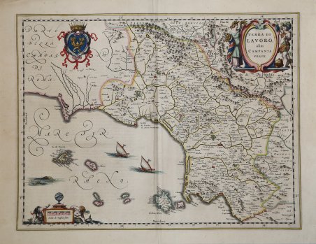 Bellissimo esemplare della carta della Terra di Lavoro di W. J. Blaeu, dall'edizione francese dell'Atlas Nouveau.La carta si basa sull'opera di Giovanni Antonio Magini, del quale è una fedele replica. Willem Janszoon Blaeu, avviò nel 1599 la sua attività di costruttore di globi e strumenti astronomici ad Amsterdam. Nel 1630, dopo aver comprato alcune lastre dell’atlante del Mercator da Jodocus Hondius II, fu in grado di pubblicare un volume di 60 mappe con il titolo di ' Atlantis Appendix. Cinque anni dopo, pubblicò i primi due volumi del suo atlante ' Atlas Novus ' o ' Theatrum Orbis Terrarum, ' in sei libri. Dopo la sua morte, Joan (Johannes) continuò l’opera paterna, completando l’intera serie di sei volume dell’Atlas Novus ' intorno al 1655. Fu inoltre autore di un ' Atlas Maior sive Cosmographia Blaviana, in 12 volumi pubblicati nel 1662 -72, dei quali uno dedicato all'Italia. La carta compare per la prima volta nel terzo volume del ' Theatrum. ' Secondo Koeman viene pubblicata in primis nell'edizione francese del 1640, dal titolo ' Le Theatre du Monde ou Nouvel Atlas, ' Mis en lumiere par Guillaume & Jean Blaeu. ' Troisieme partie. A Amsterdam, Chez Iean & Corneille Blaeu MDCXL. Il terzo volume del ' Theatrum ' contiene 58 carte dell'Italia e 4 della Grecia (cfr. Koeman, ' Atlas Neerlandici, pp. 160-162, Bl 35A). Le carte dell'italia derivano tutte dall'opera di Giovanni Antonio Magini. Tuttavia, sembra più probabile che il Blaeu si basi sue quelle di Hendrick Hondius e Johannes Janssonius pubblicate nel ' Theatrum Italiae in quo Eius Regna, Domina, Ducatus, Et Speciatim Illorum Provinciae, Tabulis Accuratissimis, Iam, De Novo in Lucem Editio, Describunter, Quorum Sequens Pagina Indicabit, stampato ad Amsterdam da Hendrick Hondius nel 1636. ' Sebbene pubblicate dopo la morte di Willem Janszoon Blaeu (1638) le carte spesso recano il suo imprint. Non è dato sapere se fossero tutte già pronte o se i figli Johannes e Cornelis le compilarono postume. Incisione in rame, magnifica coloritura coeva con rialzi in oro zecchino, in ottimo stato di conservazione. Striking wide margined example of Blaeu's decorative map of the Terra di Lavoro.Willem Janszoon Blaeu, started in 1599 his business as a builder of globes and astronomical instruments in Amsterdam. In 1630, after buying some plates of the Mercator atlas from Jodocus Hondius II, he was able to publish a volume of 60 maps under the title ' Atlantis Appendix. Five years later, he published the first two volumes of his atlas ' Atlas Novus ' or ' Theatrum Orbis Terrarum, in six books. After his death, Joan (Johannes) continued his father's work, completing the entire six-volume ' Atlas Novus ' series around 1655. He was also the author of an ' Atlas Maior sive Cosmographia Blaviana, in 12 volumes published in 1662 -72, one of which was devoted to Italy. The map first appears in the third volume of the Theatrum. According to Koeman it is first published in the French edition of 1640, entitled Le Theatre du Monde ou Nouvel Atlas, Mis en lumiere par Guillaume & Jean Blaeu. Troisieme partie. In Amsterdam, Chez Iean & Corneille Blaeu MDCXL. The third volume of the Theatrum contains 58 maps of Italy and 4 of Greece (see Koeman, Atlas Neerlandici, pp. 160-162, Bl 35A). The maps of Italy are all derived from the work of Giovanni Antonio Magini. However, it seems more likely that Blaeu relies on those of Hendrick Hondius and Johannes Janssonius published in Theatrum Italiae in quo Eius Regna, Domina, Ducatus, Et Speciatim Illorum Provinciae, Tabulis Accuratissimis, Iam, De Novo in Lucem Editio, Describunter, Quorum Sequens Pagina Indicabit, printed in Amsterdam by Hendrick Hondius in 1636. Although published after the death of Willem Janszoon Blaeu (1638) the maps often bear his imprint. It is not known whether they were all ready-made or if his sons Johannes and Cornelis completed them posthumously. Copperplate, in very good conditions. Cfr.