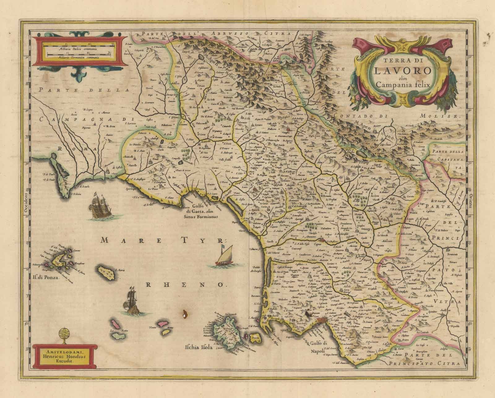 Carta geografica, entro margine graduato (non viene indicata la graduazione della longitudine), raffigurante il territorio della Terra di Lavoro, nel Regno di Napoli. Sono indicati i territori confinanti evidenziati da relativa coloritura confinale coeva all'acquerello. Il titolo si trova iscritto in decorativo cartiglio nell'angolo in alto a destra, mentre le scale grafiche sono indicate in decorativo riquadro nell'angolo in alto a sinistra. Nell'angolo in basso a sinistra, entro semplice riquadro sormontato da una sfera armillare, è riportata l'indicazione editoriale. Molto buono lo stato di conservazione generale. Piega centrale editoriale